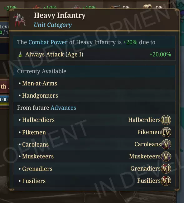 单位升级路径 当你打开单位类型的详情面板时,无论是在单位侧视图中,还是将鼠标悬停在工具提示中的单位上,现在都会看到一个视觉条带,显示该单位所属的完整升级链。 前身单位显示在左侧,当前单位在中央高亮显示,后续单位则在右侧延续,每个单位之间用箭头分隔,并标注有时代图标。 此布局与已有的建筑升级路径显示方式相似,为军事单位提供了同样直观的可读性。你不再需要在脑海中记住哪些旧单位最终可以升级为骑士或西班牙大方阵步兵;其升级脉络在卡片上一目了然。