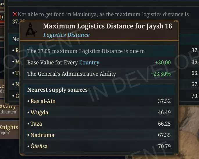 永远不要相信步兵不会太快吃光食物…… 由于这种调整,非辅助单位的内部库存只能携带大约半个月的食物补给,这意味着脱离补给线的军队将在几周内而非几个月内感受到压力。 后勤距离已缩短,基础补给范围从50缩减至30,因为早期时代的军队补给范围与当时原始的补给基础设施并不匹配,这一修正使得在14和15世纪维持军队的粮食供应成为一项真正的挑战。