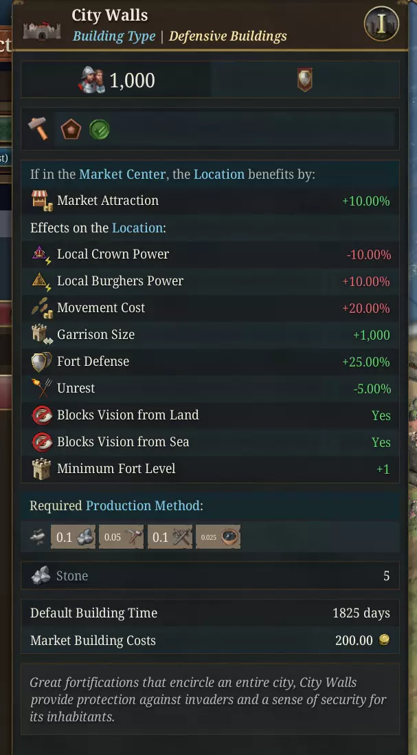 现在向盟友提供舰队将变得有用! 城市城墙 城市城墙是城市和大都市特有的建筑,代表着定义了中世纪和近代早期城市 warfare 的石制防御工事。与普通堡垒会将其等级叠加在现有防御之上不同,城市城墙的作用机制有所区别:它们提供最低1级的堡垒等级。这意味着一座没有自身堡垒的有城墙城市在战斗时会如同拥有1级堡垒一般,但如果你之后在那里建造了一座实际的堡垒,城墙不会简单地叠加等级。相反,会取较高的数值生效,城墙则悄然退居其次。古老石制城墙后的驻军仍能从中受益,但一座正规的堡垒会使城墙变得多余。这种区别在围城计算、控制区域以及国库的要塞上限成本方面都有影响:城墙的权重仅为真正要塞的一半,这反映了城墙是定居点自身的防御设施,而非专门的军事建筑这一现实。