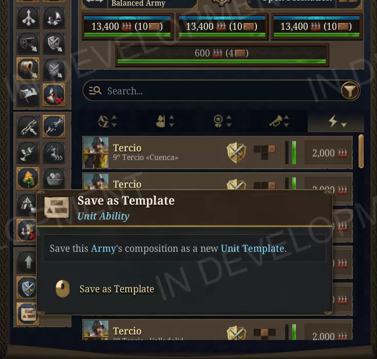 此提示框还包含其他增益效果…… 雇佣兵的招募与贿赂费用增加25% 雇佣兵作为一种军事解决方案过于容易获取,尤其对于那些希望绕过常备军人力和招募成本的国家而言。我们已将所有招募溢价和贿赂成本提高约20-25%:领袖招募费、单位招募溢价以及贿赂遣散费均有所上涨。这使得雇佣兵成为一项有意义的财务投入,而非简单的替代品,并强调维持一支专业的常备军,或培养良好的外交关系以避免需要贿赂外国军队的行为应得到奖励。 改进的界面 保存为模板 军队管理变得更加便捷。现在,你可以在部队界面中通过一键操作将任何现有军队直接保存为模板。模板编辑器会预填充该军队当前的军团组成,但会排除征召兵和雇佣兵,因为这些并非你想要为未来使用而规划的常备部队。此外,从模板招募军队时,模板现在更加智能:游戏不再坚持使用保存时记录的确切单位类型,而是会在招募地点自动替换为同一类别中可用的最佳单位。随着你的军事科技进步,模板将保持实用性,无需你每次解锁新单位等级时都返回去更新它。