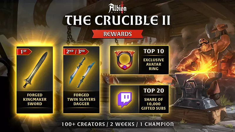 坩埚之战II的前三名将获得由钢铁锻造的现实世界奖品。我们与传奇工匠团队That Works合作,打造了以阿尔比恩为灵感的武器,这些武器通过专业的精度和细节得以呈现。冠军将获得一把巨大的造王者之剑,而第二名和第三名则各获得一把锋利的双杀者匕首。每把武器均由手工单独锻造、塑形和抛光,将阿尔比恩最具标志性的设计转化为令人难忘的战利品。但奖励不止于此。排名前十的公会成员将获得专属的游戏内头像戒指以作纪念,而排名前二十的创作者将根据其最终名次获得总计10000个Twitch订阅的份额: 1. 第一名:2000个订阅 2. 第二名至第五名:1000个订阅 3. 第六名至第十名:500个订阅 4. 第十一名至第二十名:150个订阅 观看并赢取奖励 熔炉II活动旨在让社区团结起来。在Twitch上,你可以直接支持你喜爱的创作者,同时赢取奖励。向任何熔炉活动参与者或阿尔比恩Online创作者计划成员赠送两个订阅,将自动为你解锁毛茛坐骑皮肤。在聊天中寻找可爱的野猪头像,你就知道找对地方了。