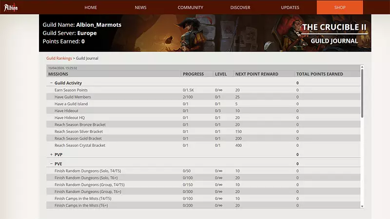 来自全球的100多位创作者将踏入竞技场,每位创作者都将带领自己的公会参与这场全球顶尖之争。桂冠之战即将点燃。 各服务器活动时间: 阿尔比恩亚洲:4月16日23:00(UTC)-5月3日23:00(UTC) 阿尔比恩美洲与欧洲:4月17日11:00(UTC)-5月4日11:00(UTC) 活动规则: 熔炉之战II采用基于专用公会日志的积分系统,该日志是专为本次活动创建的。创作者及其公会通过完成日志中的任务来竞争获取积分。 随着任务的完成,积分将被添加到公会的总分中。这些分数会在阿尔比恩Online官网的【实时排行榜】上进行追踪,所有参与的公会都会在该榜单上实时排名。