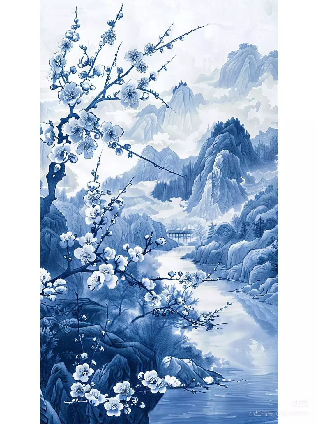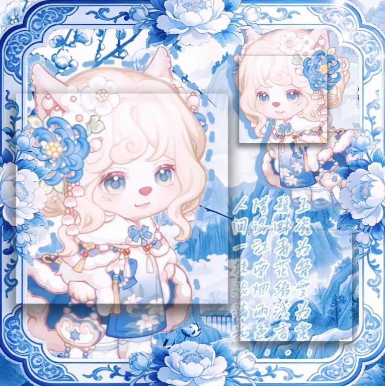 这是一组奥比岛青花国风主题的美图,展示了带有青花元素的奥比岛角色穿搭,搭配青花山水背景,风格雅致,尽显国风韵味。