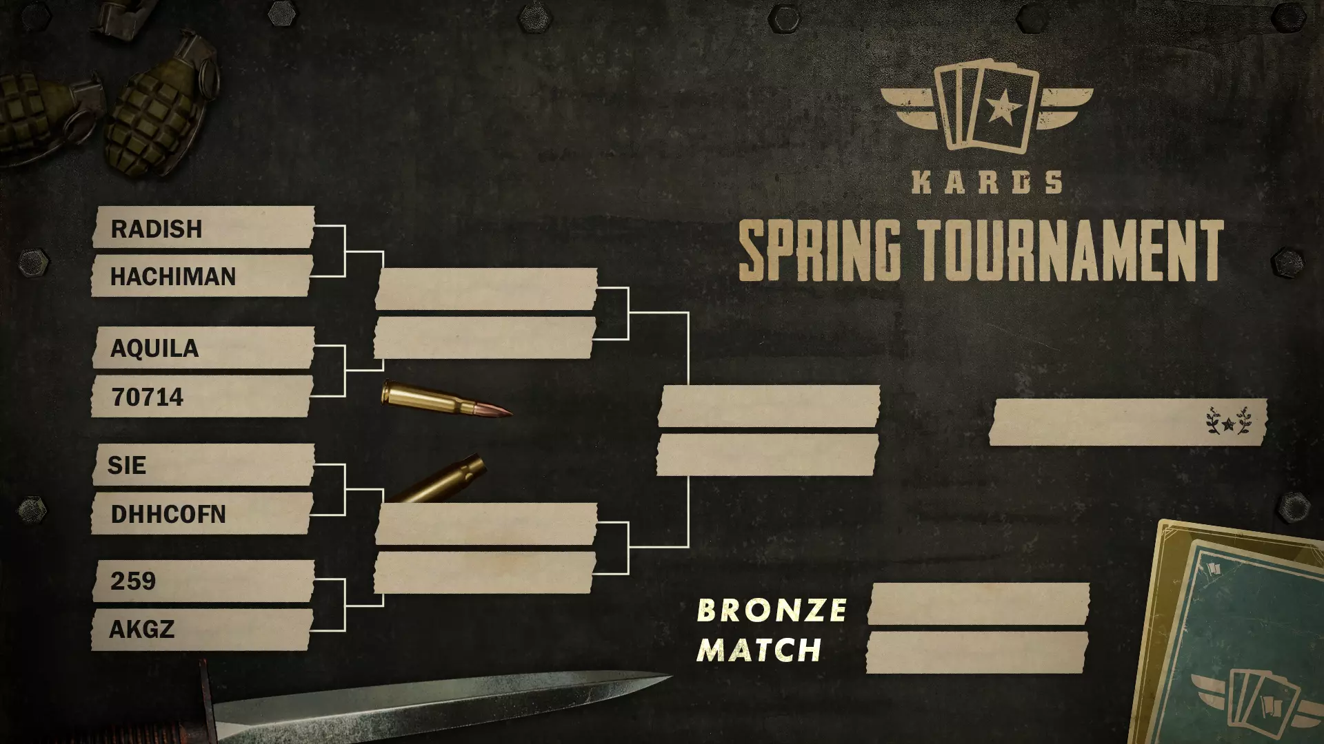 各位指挥官注意! 所有准备工作已完成。《KARDS》春季锦标赛总决赛将于本周末——4月17日和18日UTC时间11:00现场开赛。 本次赛事比往常提前一天开始,调整为周五和周六进行。 请就位,见证八强选手的最终对决: 《KARDS》TWITCH直播 仅剩八名选手。 这些精英选手从众多坚定的挑战者中脱颖而出,历经预选赛和瑞士轮的考验,最终登上决赛战场。现在,他们已准备好争夺春季锦标赛冠军,并分享3000美元的奖金池。在战役结束时,只有一名指挥官能够脱颖而出,赢得胜利。 在四个季节性赛事中,指挥官们将为获得今年十月举办的KARDS世界锦标赛参赛资格而战——届时,12名顶尖选手将与去年的精英四强选手一同参与最终对决,角逐12,000美元奖金及至高荣誉。 决赛选手 通往决赛的道路充满挑战。32名竞争者参与了角逐,但只有最坚韧不拔的选手成功晋级。剩下的八名选手现已准备好迎接最终决战。