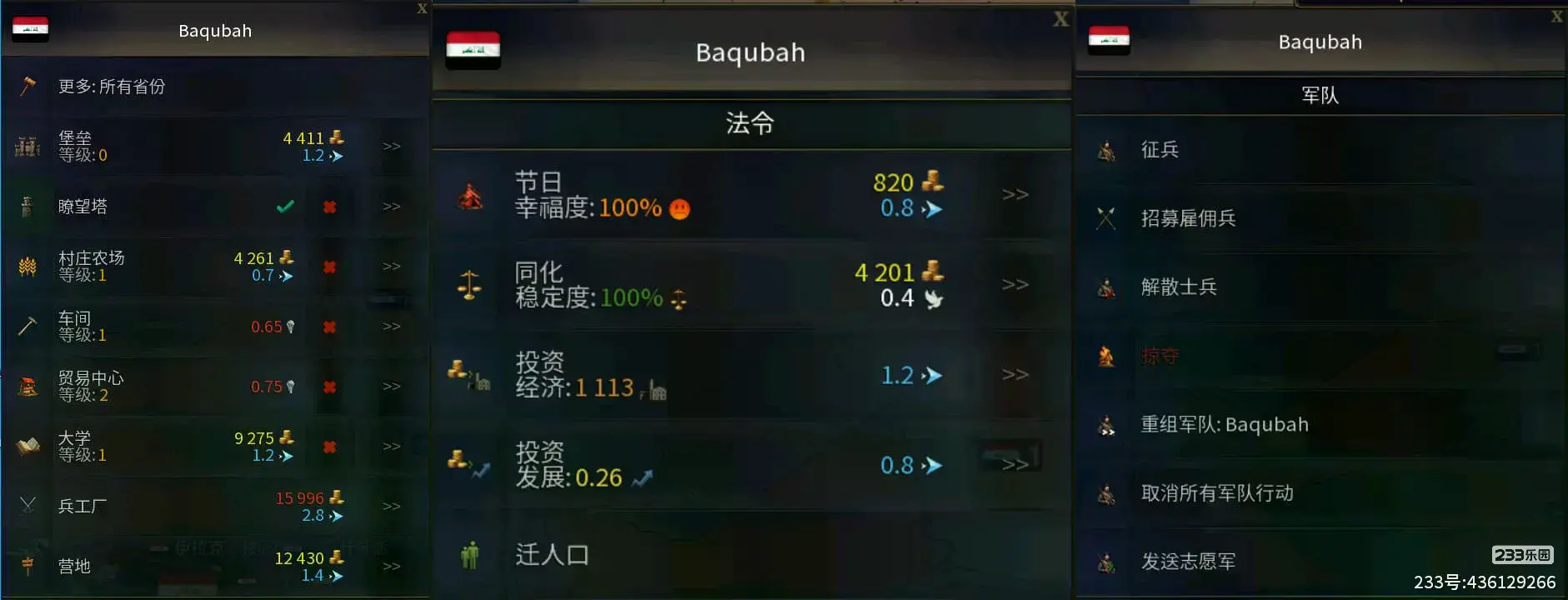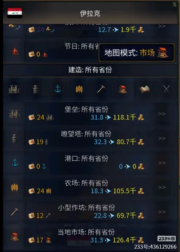 上图中可以看见【收入、支出】,两者相减得到的数就是(每一回合)可以存入国库的金币数量;而国库的金币可以用来在地区建筑【市场、农场】等建筑物进一步提高国家的收入(下图右侧就是建筑列表)