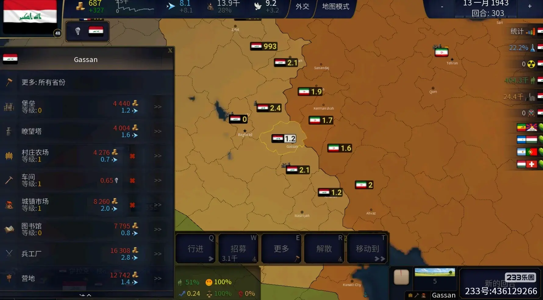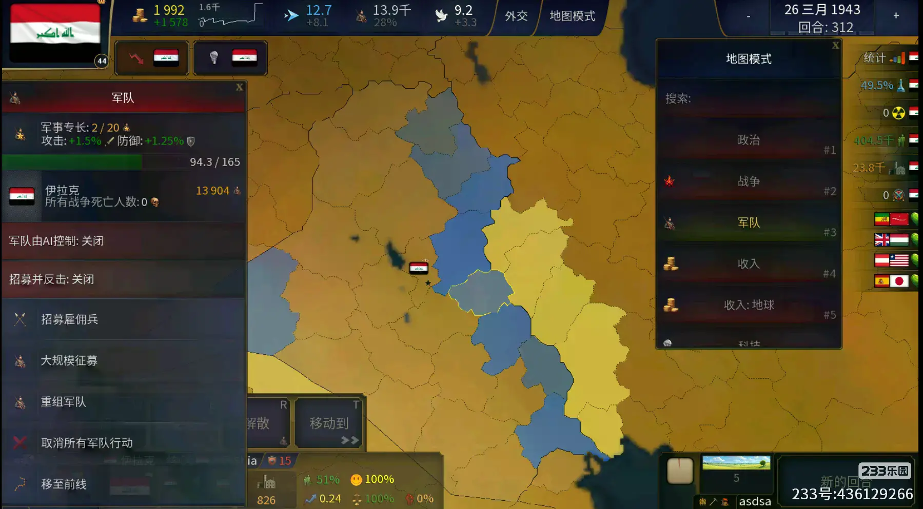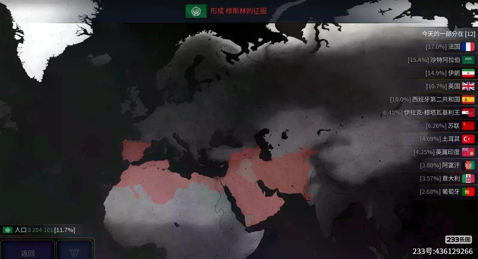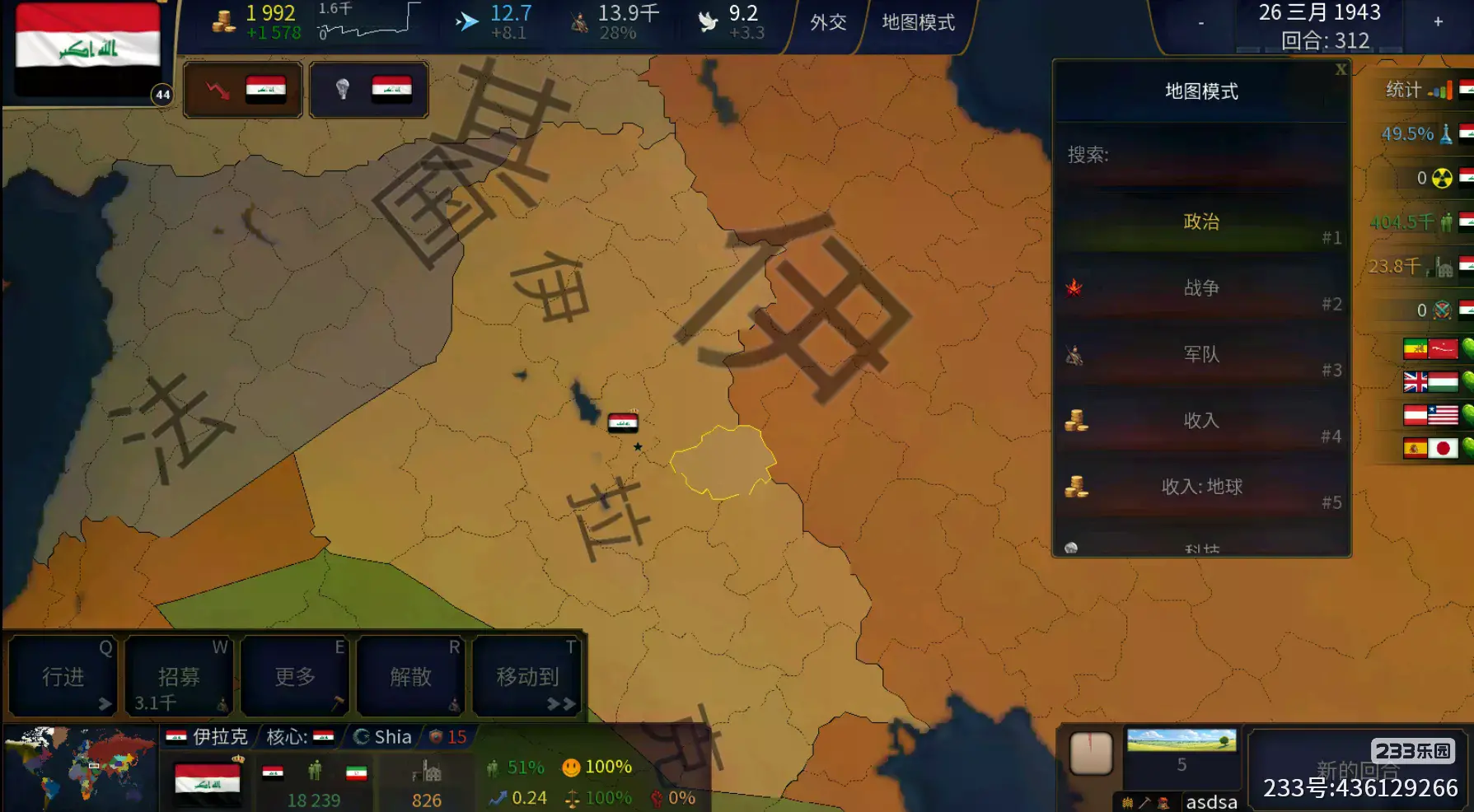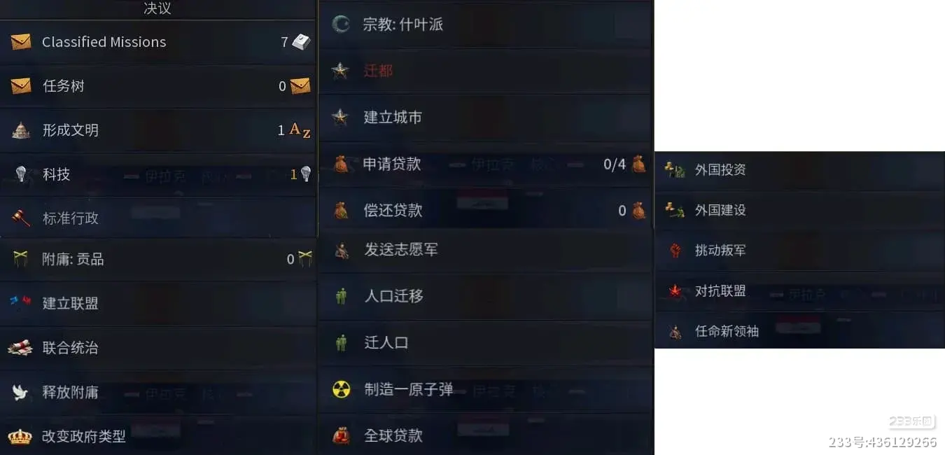 形成文明:就是占领一些地区后,可以直接将这些地区整合并改国名为新文明的国名,例如伊拉克可以建立穆斯林征服文明(也就是历史上的阿拉伯帝国),需要占领的地方如下图标红的地区。