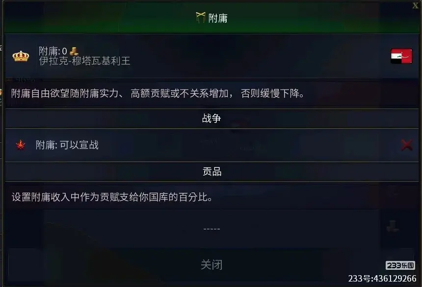 附庸(贡品):当我们击败某一国家并将其变成附庸后就能在这里设置对应的上交的贡品比例,此外还能设置附庸能不能自主宣战其他国家的权利