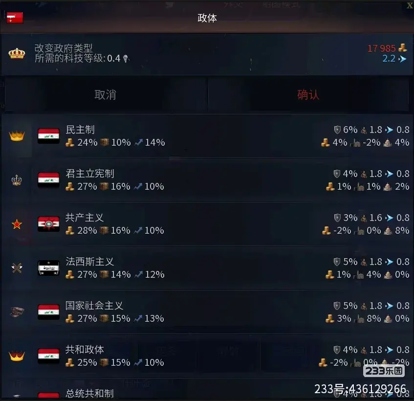 改变政府类型:就是改变政体(如下图);对应的政体有对应的增益和负面效果,也需要自行选择