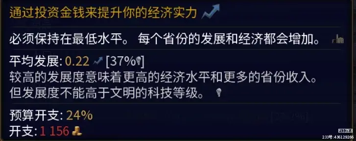 如上图的37%就代表提高经济投资的话能获得更多的收益。当这个百分比达到100%的话就说明经济投资到了瓶颈期,此时应该降低经济投资,转而提升研究科技的开支