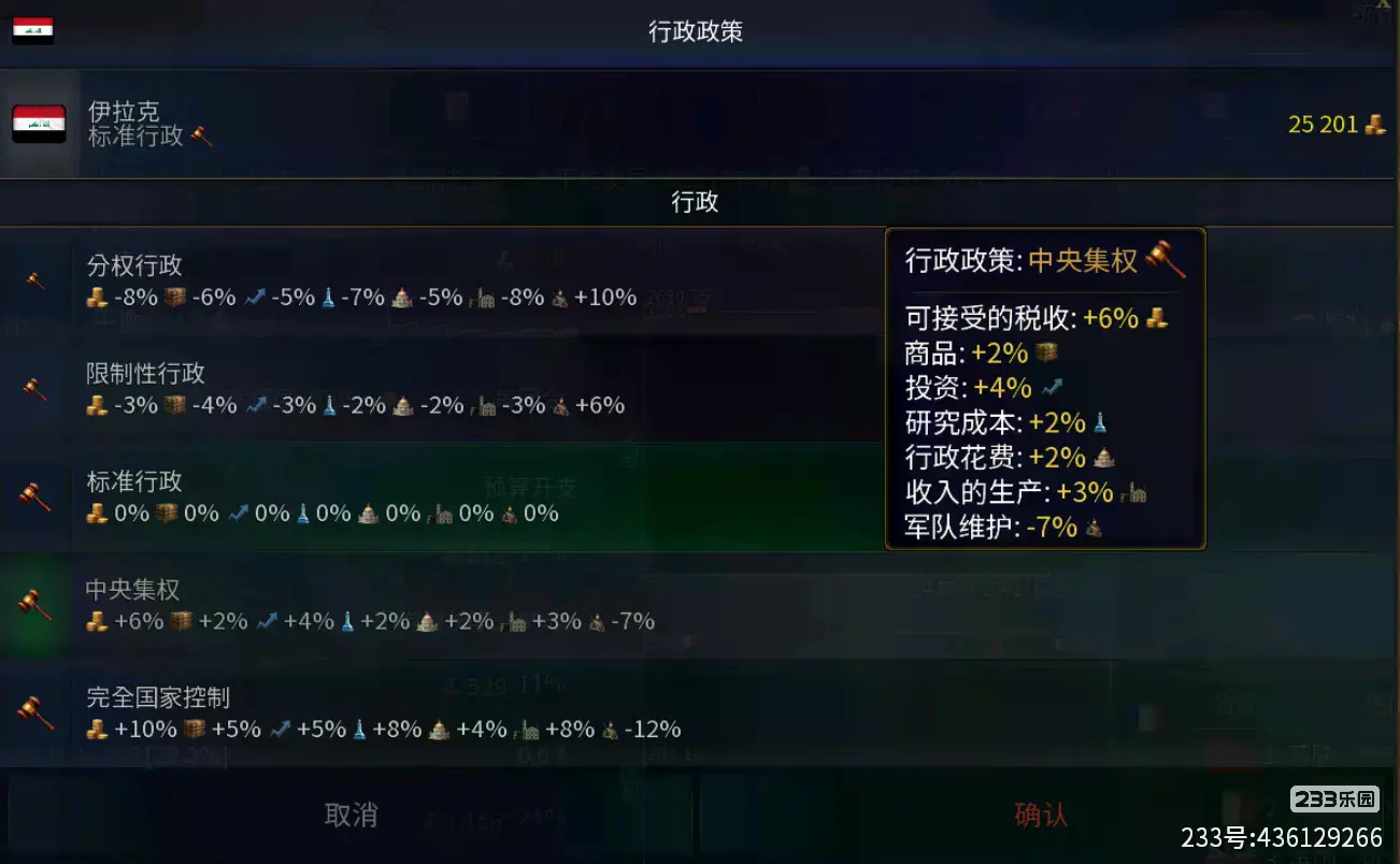 如上图中,当选择【中央集权】的时候,“税收、收入生产“这两个增加收入的得到提升,但是”商品、投资、研究成本、行政花费“的最低要求也得到了增长,如果你的税收与收入生产基数高,那么选择中央集权确实是不错的。