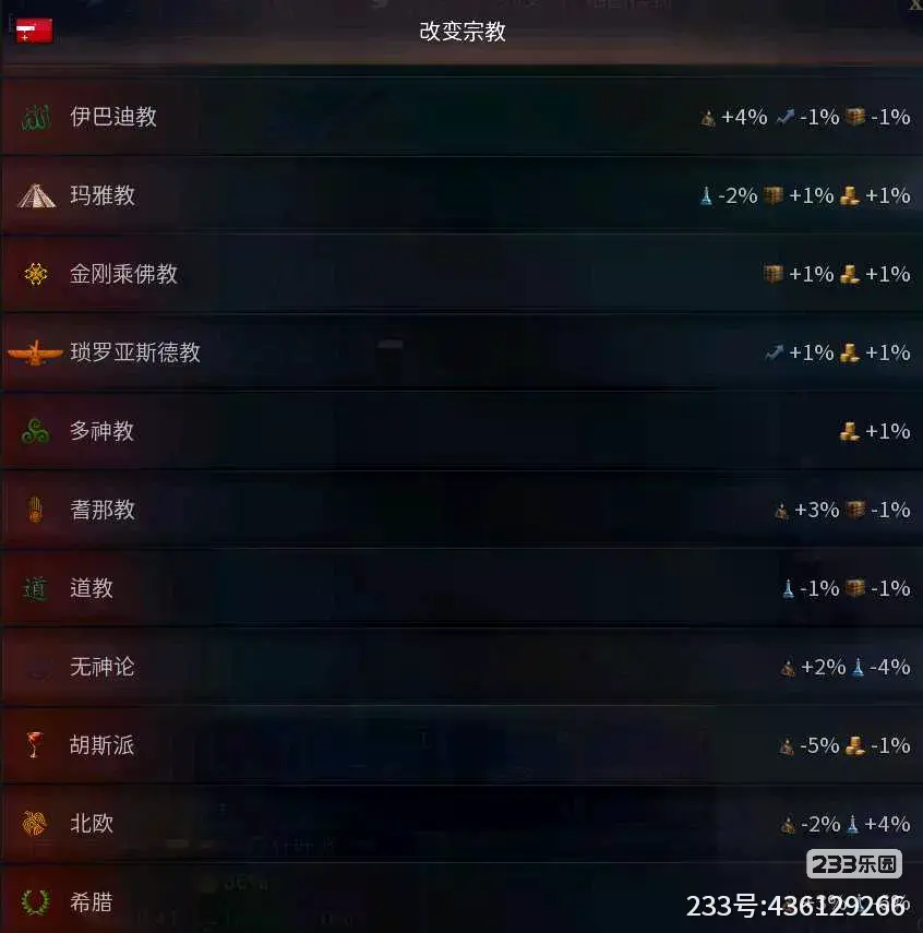 改变宗教:和改变政体一样,每个宗教思想会有对应的增益和减益(当然你也可以选无神论)