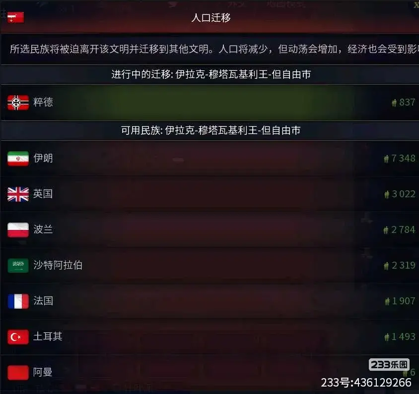 人口迁移:这个其实应该是驱逐人口(如下图),就是把某国的人直接驱逐走,不过会产生各种DEBUFF;需要注意的是与迁人口不同,迁人口是国家内部省份之间的人口迁移