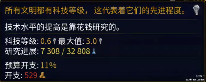 不过研究科技点的开支在游戏前期还是不要太多就行(可以不给开支但是不建议这么做),因为前期需要把钱用在地区基础建设中,等建设好基础建筑物后再抬高研究方面的开支以解锁更高的建筑物等级。
