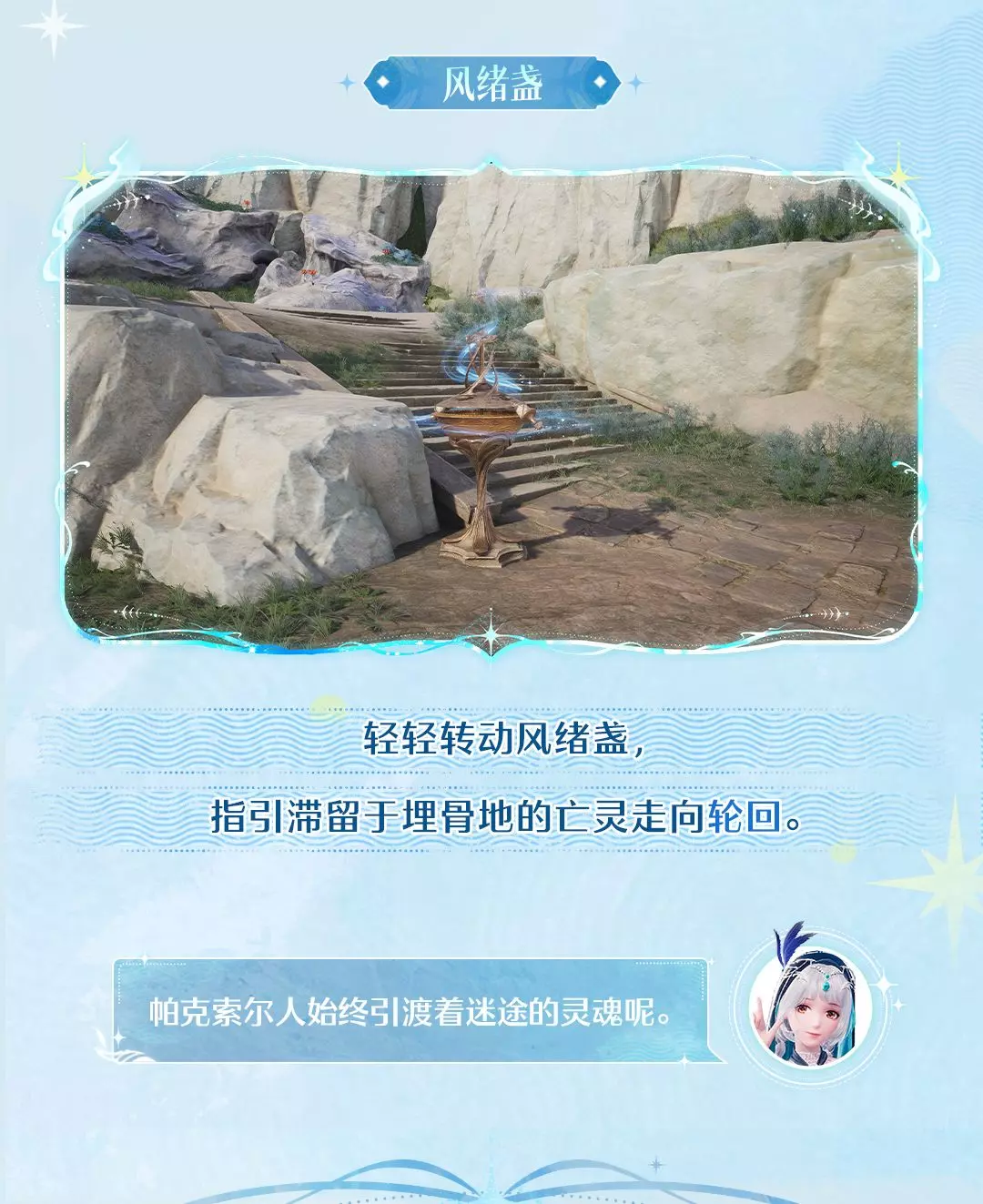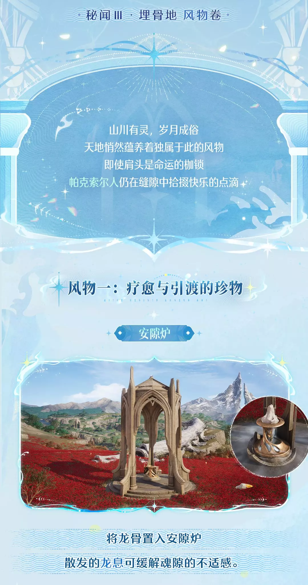埋骨地——轮回之神诞生之所。 巨龙残骸见证不灭的烙印, 古老魂埙引渡众灵至彼岸。 潮汐往复不息,枯寂亦有黎明, 漫长的苦行,是徒劳,还是无尽的守望—— 《无限暖…
