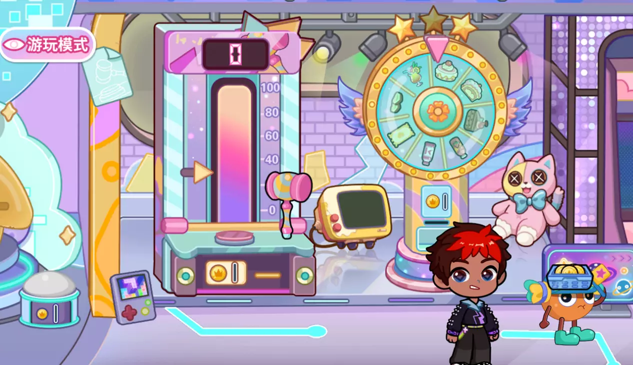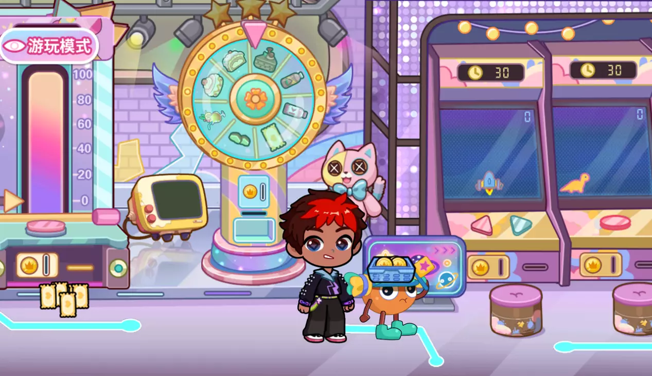 投币后,点击开启旋转转盘,转盘停下后会掉落对应奖励物。