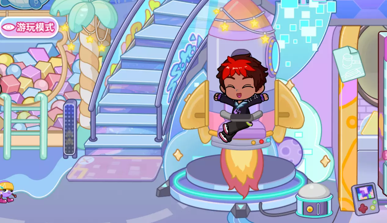 把角色放到火箭坐垫上,投币后按下按钮,火箭就会带着角色飞天再下落。