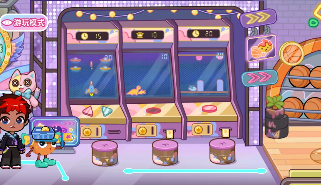 桌上的卡片不是摆设~把卡片拖动到出币机,会掉落大量的游戏币。可以先多拿一些来体验后面的游戏机。