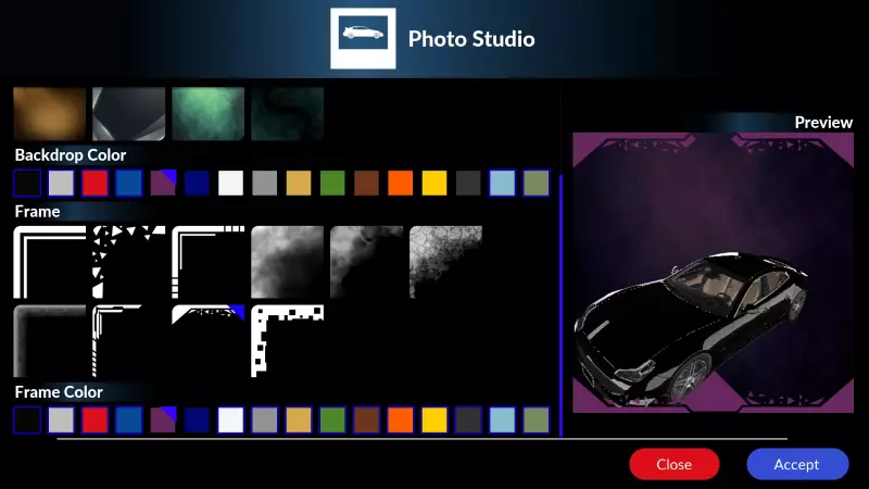 购买后,摄影棚中会出现一个新面板,让你可以选择新的背景和相框,并自定义它们的颜色。