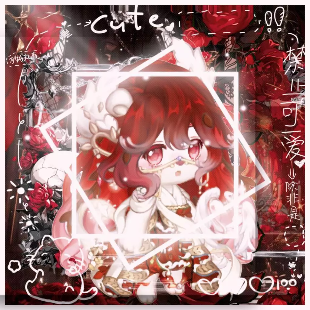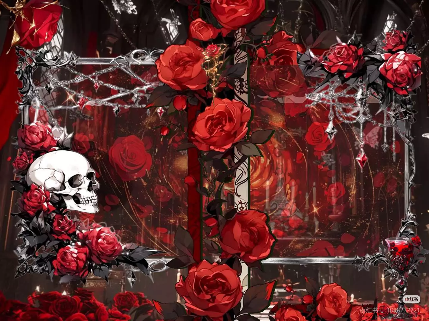 这是一组奥比岛美图,展示了带有玫瑰、锁链元素的暗黑风奥比岛穿搭,搭配华丽的红玫瑰暗黑系背景,风格精致独特,氛围感拉满。
