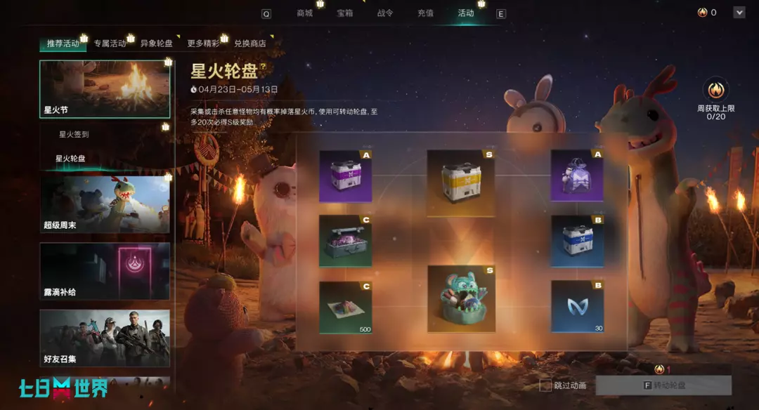 抽奖规则:每次转动轮盘仅需消耗1枚“星火币”。奖池共分为S、A、B、C四个档位,奖励丰厚,逐级递增!