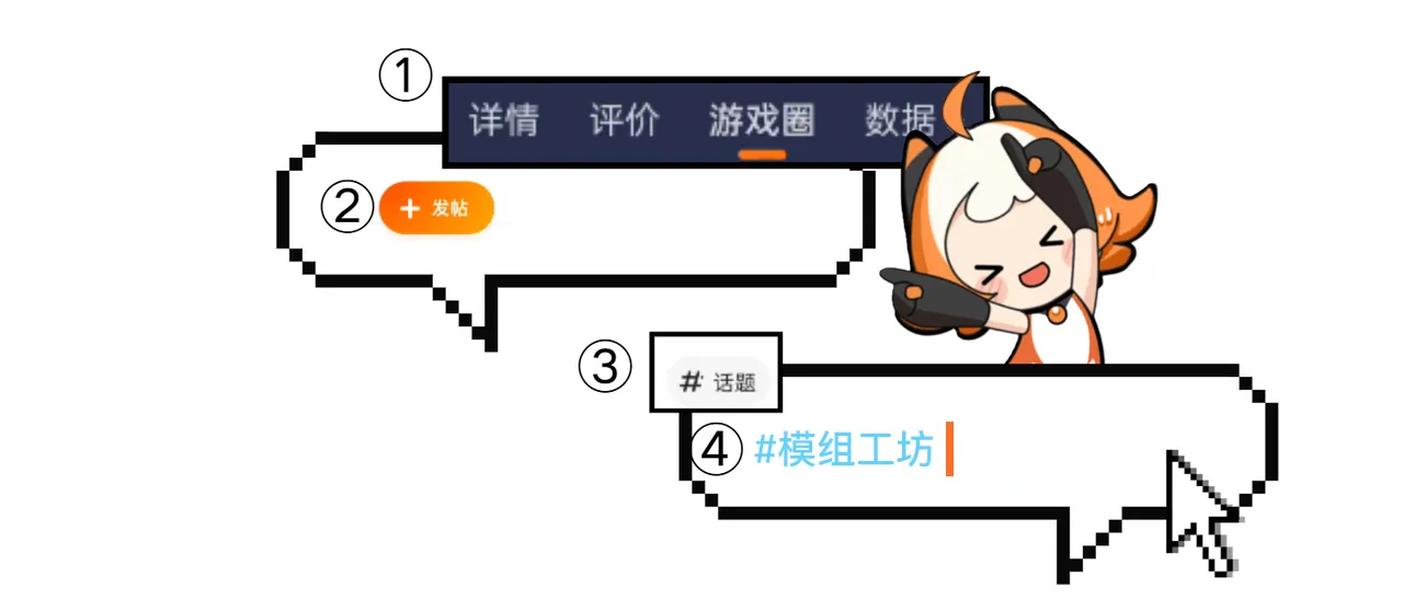 分享自己在游戏内创作的模组/皮肤/蓝图作品,在对应游戏圈发布并带上话题#模组工坊,即可成功参与活动(限时)