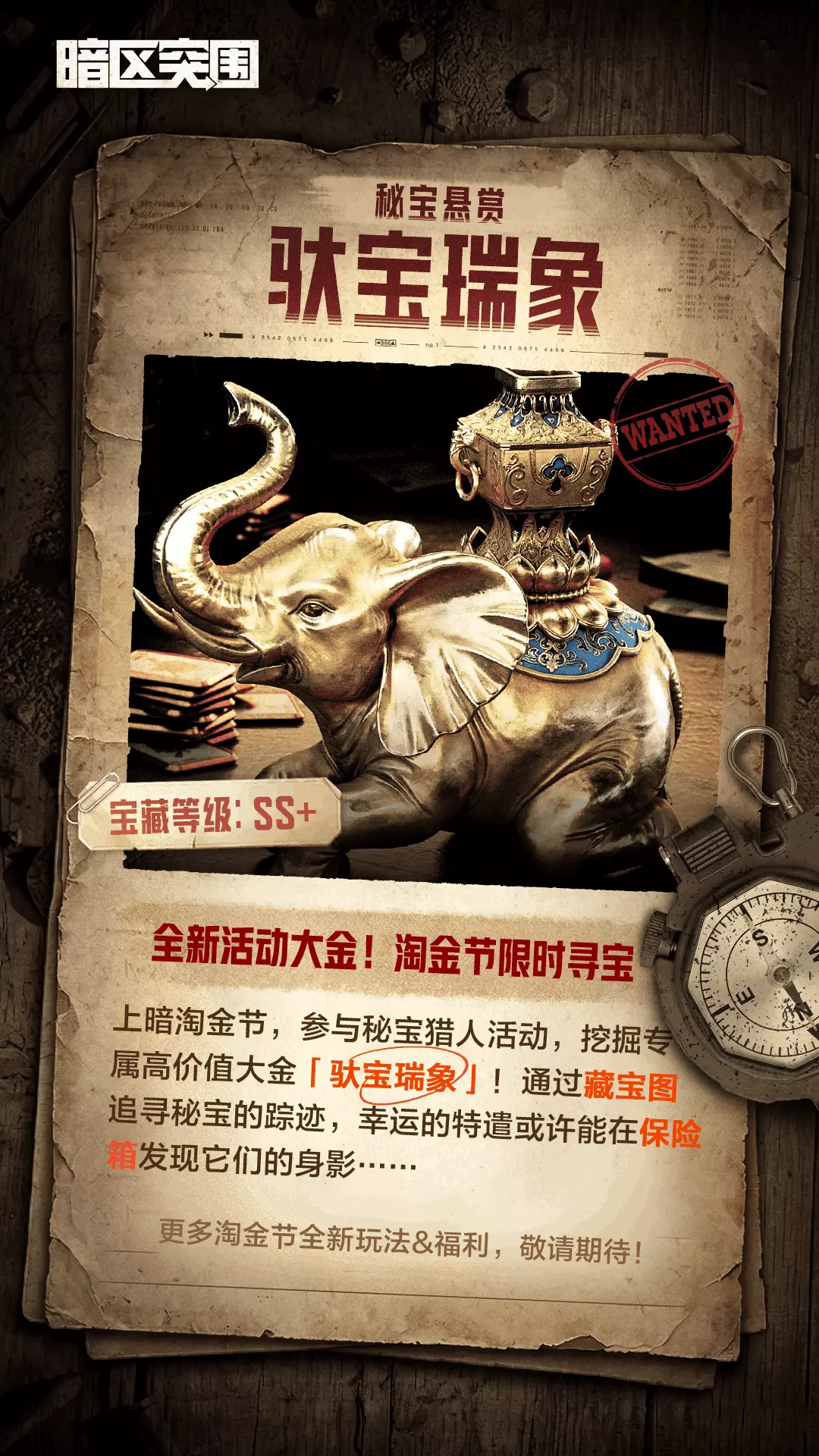 活动期间,参与秘宝猎人活动,挖掘专属高价值大金【驮宝瑞象】!通过藏宝图追寻秘宝的踪迹,幸运的特遣或许能在保险箱中发现它们的身影...