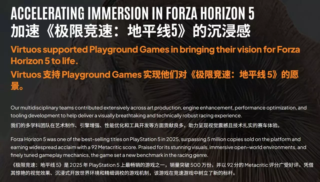 微软旗下知名赛车游戏《极限竞速:地平线5》在PlayStation 5平台取得了令人瞩目的商业成功。游戏联合开发商维塔士(Virtuos)近日在其官网发布的信息图显示,该作成为2025年PS5平台最畅销的游戏之一,销量已突破500万份,并获得Metacritic 92分的高评价。