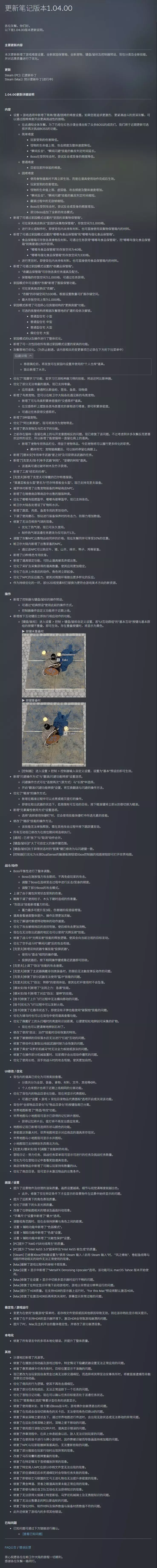 游戏内容: 新增简单、普通、困难三种难度设置 新增“坚固的采集物保管箱”,存放空间1000格 新增“嘟嘟鸟食品保管箱”和“嘟嘟鸟强化食品保管箱” “嘟嘟鸟食品保管箱”存放空间40格 “嘟嘟鸟强化食品保管箱”存放空间330格 新增“收藏品保管箱”,保管箱的存放空间为1000格,可通过任务获得 “衣橱”新增服装保管功能,存储空间100格,根据设置数量可扩展存储空间,最大存放空间上限为1000格 新增“更换房屋”功能 优化家园模式的UI及操作 新增可一次性回收所有通过家园模式设置的家具的功能。 优化灰鬃营地 优化“观摩学习”功能,若学习已消耗神器习得的技能,将返还阿比斯神器 优化部分无法堆叠的道具,现已支持堆叠 新增鸟类宠物 新增5种猫宠物 优化“阿比斯黑狼”,现可将其作为宠物带走 新增更改宠物及马匹名字的功能 德米安新增专用单手武器“星之剑”及可获得该武器的任务 克里夫/翁卡新增单手武器“树枝”、“坚硬的树枝”道具 新增工具“结实的扫帚” 克里夫新增可穿戴的巴尔特恩服装 “莱基亚板金头盔”更名为“巴尔特恩板金头盔”,现已支持克里夫装备 福罗林村新增出售宠物装备的神秘商店NPC 新增在暗巷商店等商店中出售的服装种类 优化嘟嘟鸟阻燃盔甲、嘟嘟鸟御寒盔甲,现已支持染色 帕卫尔大陆各处增设了矿物和水井 新增蔬菜、肉类、鱼类专用的烹饪动作 下调使用磨石、铁砧进行装备保养时的攻击力、防御力增加数值 修复无法召唤热气球的现象 调整灰鬃NPC出售物品给同伴的价格,现在灰鬃同伴可享受10%的优惠 新增出售家畜的NPC 新增13种角色专用纹身 新增道具锁定功能,可防止道具被丢弃或出售 优化采矿及采集获得的道具数量 优化在床上休息后的动作,角色将立即起身 优化NPC的反应能力 部分2D视觉素材替换为更符合游戏美术方向的新资源 游戏操作: 新增控制器与键盘/鼠标的操作预设 控制器操作自定义功能将于近期上线 新增按下互动键后立即执行相应动作的功能 新增“闪避操作方式”与“翻滚/闪避功能转换”设置选项 优化“瞄准”的操作方式 新增“元素属性使用方式”设置选项 修改“踏跃”技能的操作方法 所有互动修改为在按住期间将连续执行 将“放下”与“取消”动作合并 键盘/鼠标扩大可自定义的操作键范围 键盘/鼠标处于异常状态时的“脱离”键已修改为与闪避键一致 控制器优化为长按DualSense的触摸板按钮或Xbox控制器的视图按钮即可打开世界地图 战斗/动作、UI修改/优化、画面/设置、稳定性/游戏运行、本地化、其他如下图所示