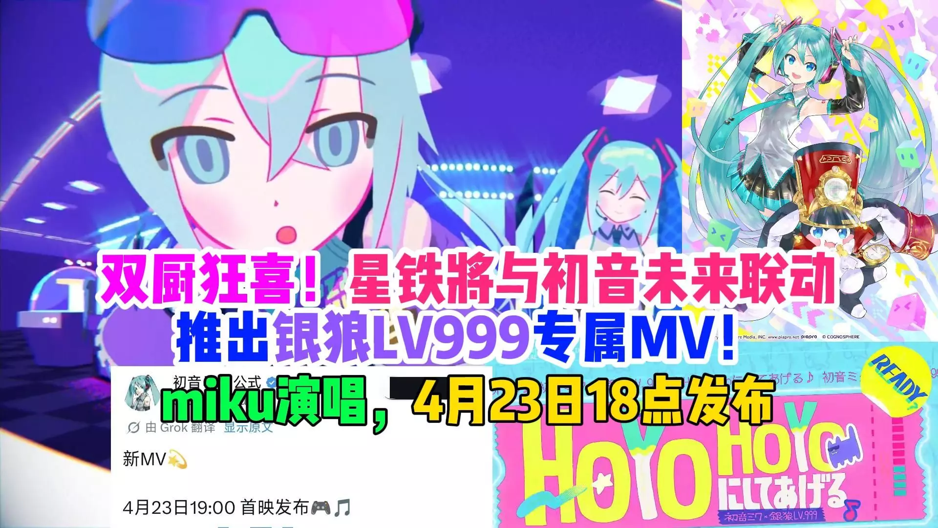 图源@ohajikihko 初音未来 ✖ 《崩坏:星穹铁道》 今日,初音未来(Hatsune Miku)官方发布与 《崩坏:星穹铁道》合作推出的新MV。 初音未来×崩坏星穹铁道银狼LV.999联动MV发布时间: 2026年4月23日19:00(日本时间) 2026年4月23日18:00(北京时间) 以下是一些联动MV截图。 联动歌曲已公布。 此次MV由团队「Hurray!」制作。