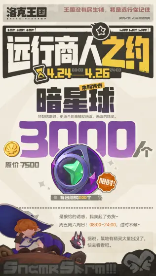 洛克王国远行商人之约活动于4.24-4.26的08:00-24:00开启,本期特供AAA暗星球,原价7500,现价3000个,每日限购200个,适合捕捉幽系、恶系精灵,本周依旧周五至周日老时间开启。