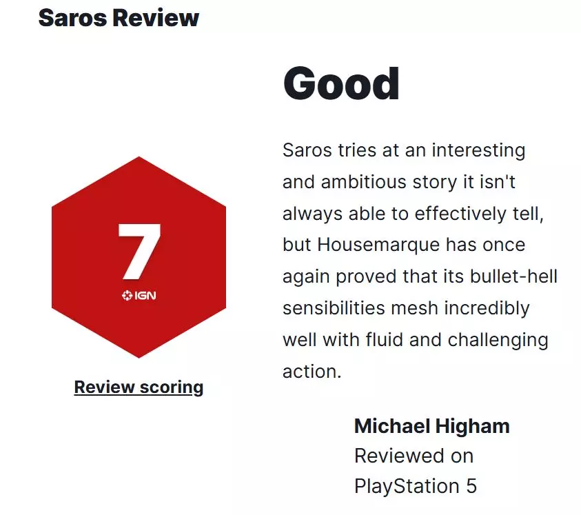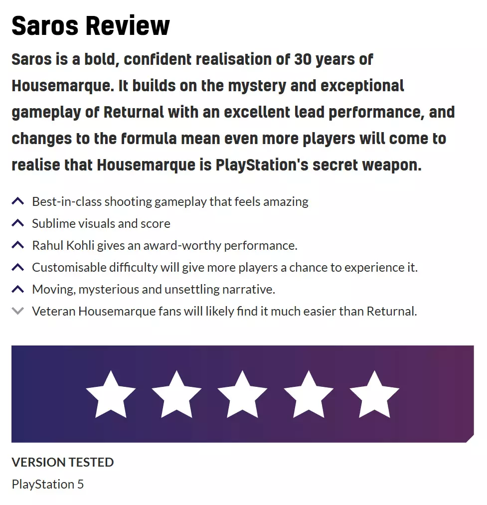 VGC:10分 《沙罗周期》是对Housemarque工作室三十载积淀一次大胆而自信的成就展现。它以出色的主角演绎为基础,延续了《死亡回归》的神秘感与卓越玩法,而对既有模式的调整意味着将有更多玩家意识到,Housemarque是PlayStation的秘密武器。 +顶尖的射击玩法,体验绝佳 +精美的视觉效果与配乐 +拉胡尔·科利献上了足以获奖的表演 +可自定义的难度设置让更多玩家有机会体验 +动人、神秘且令人不安的叙事