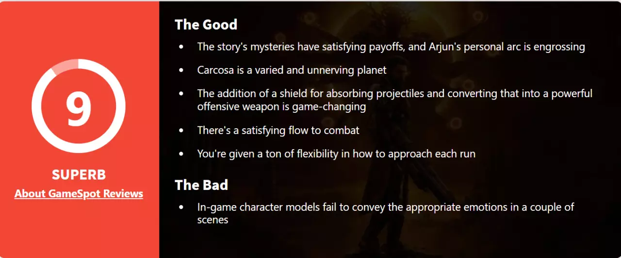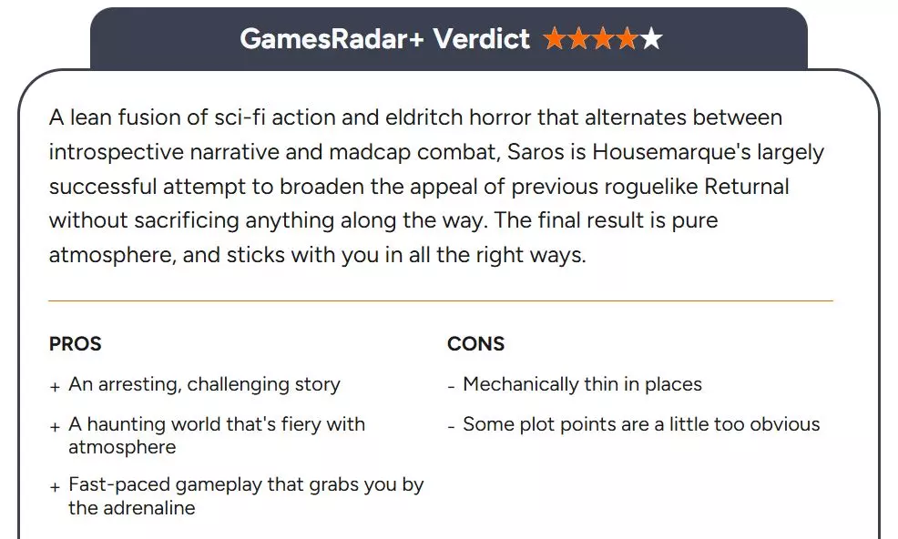 GamesRadar+:8分 《沙罗周期》是科幻动作与诡谲恐怖的精炼融合,在自省式叙事与疯狂战斗之间交替切换。作为Housemarque工作室的力作,它在未作任何妥协的前提下,成功拓宽了前作《死亡回归》类Rogue游戏的受众吸引力。最终呈现的成果纯粹而富有氛围,并以种种恰当的方式萦绕于你心间。 优点 +引人入胜且充满挑战的故事 +氛围炽烈、令人难忘的世界 +节奏迅疾、激发肾上腺素的玩法 缺点 -部分机制设计略显单薄 -某些情节转折略显直白