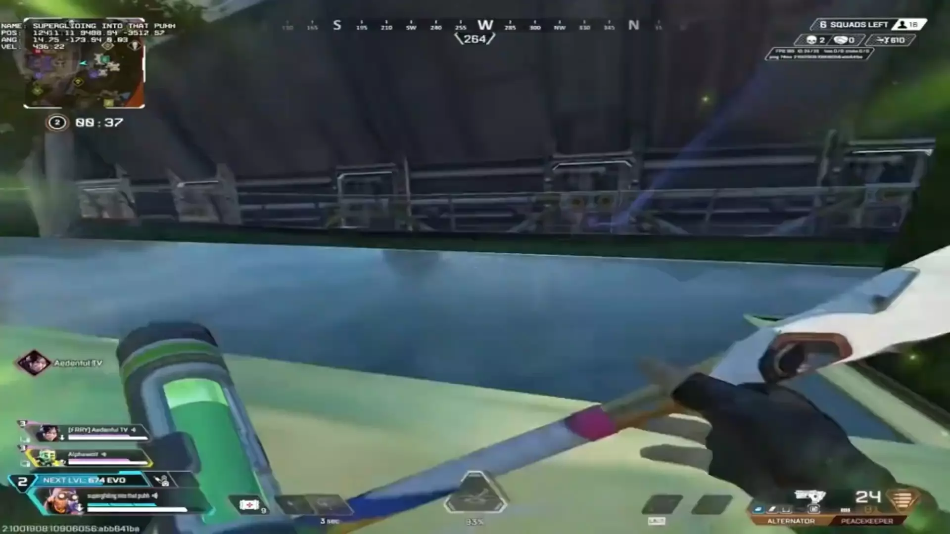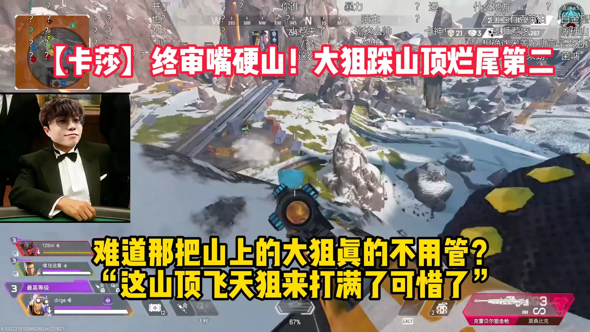 这是《Apex英雄》的游戏对战画面,玩家手持克雷贝尔狙击枪,在地图中与队友配合搜寻敌人,玩家称这把克雷贝尔狙击枪是打十年才出的,还提示可进行三级跳,呈现了紧张的对战场景。