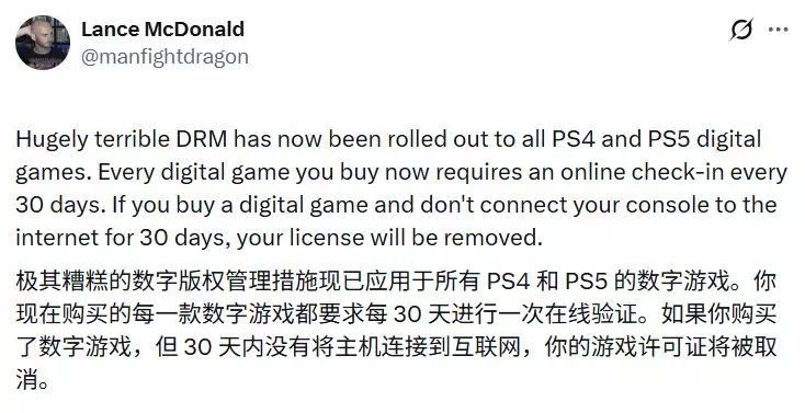 近期网络流传的说法称,索尼可能已为PS4和PS5的数字游戏引入了更严格的数字版权管理系统,尽管该信息尚未得到证实。此讨论源于改装者兰斯·麦克唐纳的帖文,他声称新购买的数字游戏现在需要定期进行在线验证。