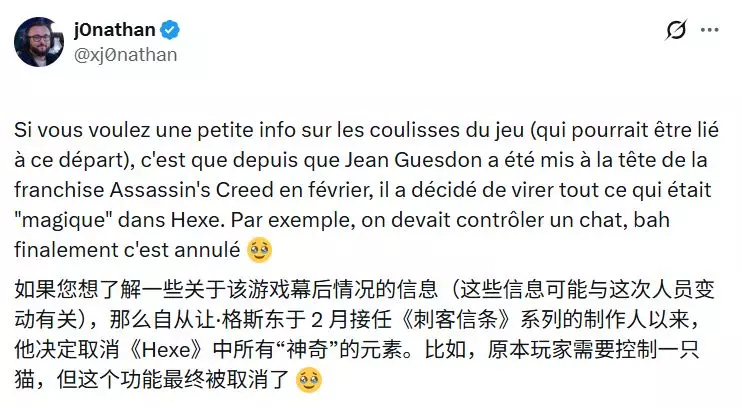 “如果你想了解一点关于这款游戏的幕后信息(这可能与此次变动有关),那就是自让·盖斯登在二月接手负责《刺客信条》系列以来,他已决定剔除《Hexe》中所有‘魔法’相关的内容,”xj0nathan表示。“例如,我们原本应该能操控一只猫,嗯,但最终这个功能被取消了。”
