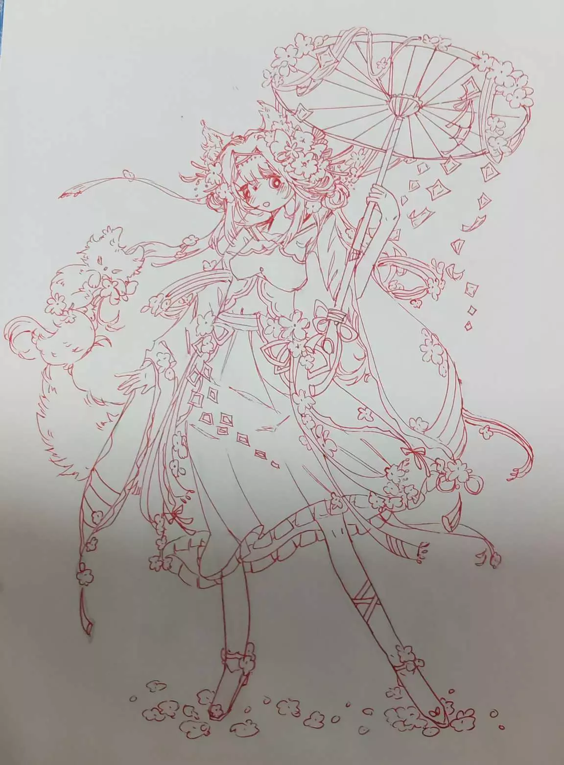 作者耗时近4小时完成一幅国风《迷你世界》角色绘画投稿,从手绘线稿到数位板上色,呈现出带有狐耳、撑伞的国风少女形象,作者因熬夜加上长时间创作感到疲惫。