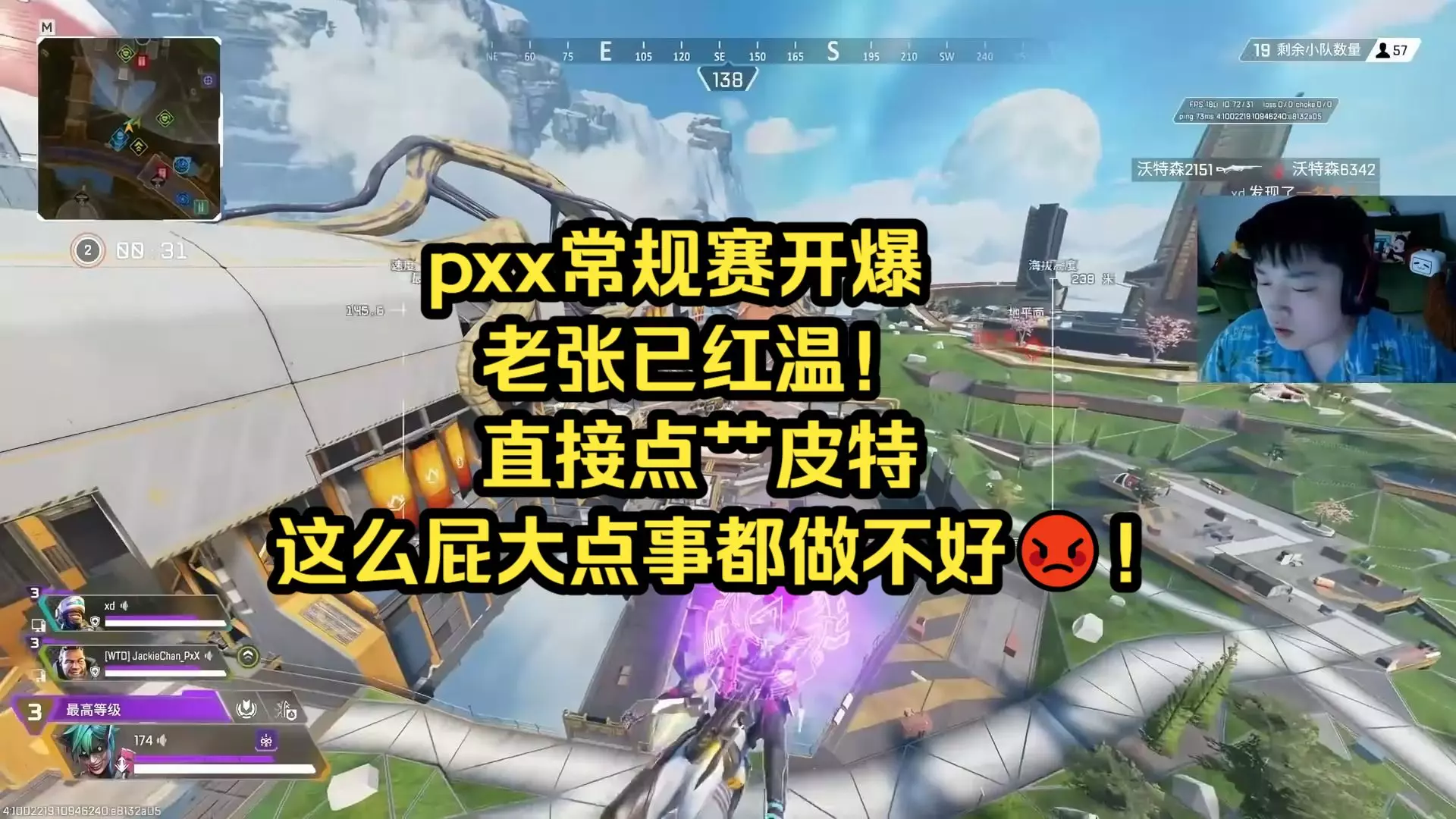 这是主播老张的《Apex英雄》常规赛直播片段,老张在游戏过程中因队友缺乏沟通情绪激动,画面呈现了游戏内对战、观战等精彩过程。