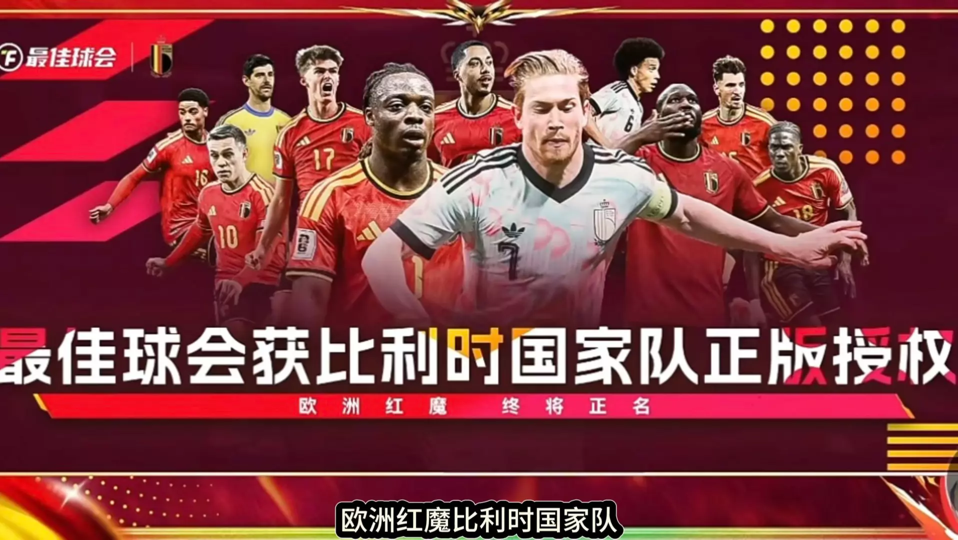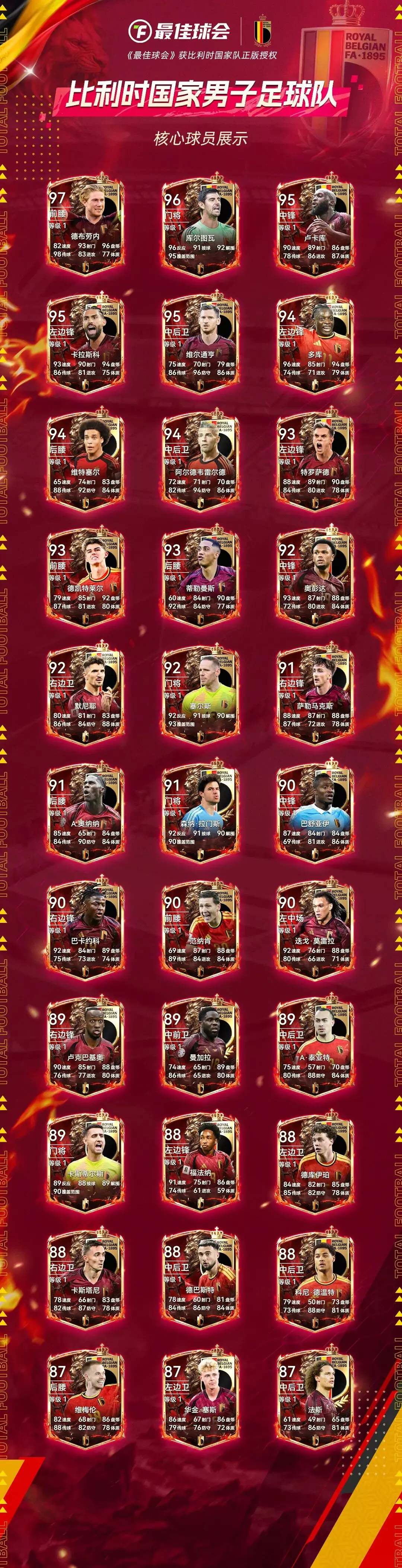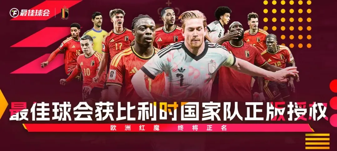 《最佳球会》获比利时国家队正版授权,推出主题球员卡面,卡面以火焰红金配色、复古盾牌轮廓为基调,搭配雄狮图腾、三叉戟元素,还展示了众多比利时国家队核心球员,尽显球队雄心。