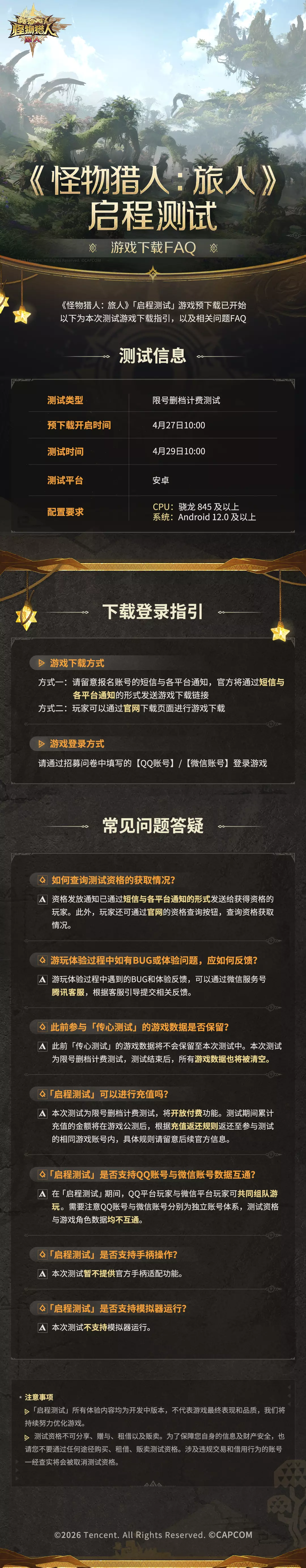 《怪物猎人:旅人》限号删档计费测试「启程测试」将于4月29日开启!测试资格将于4月24日开始陆续发放,届时请留意短信和各平台信息通知~