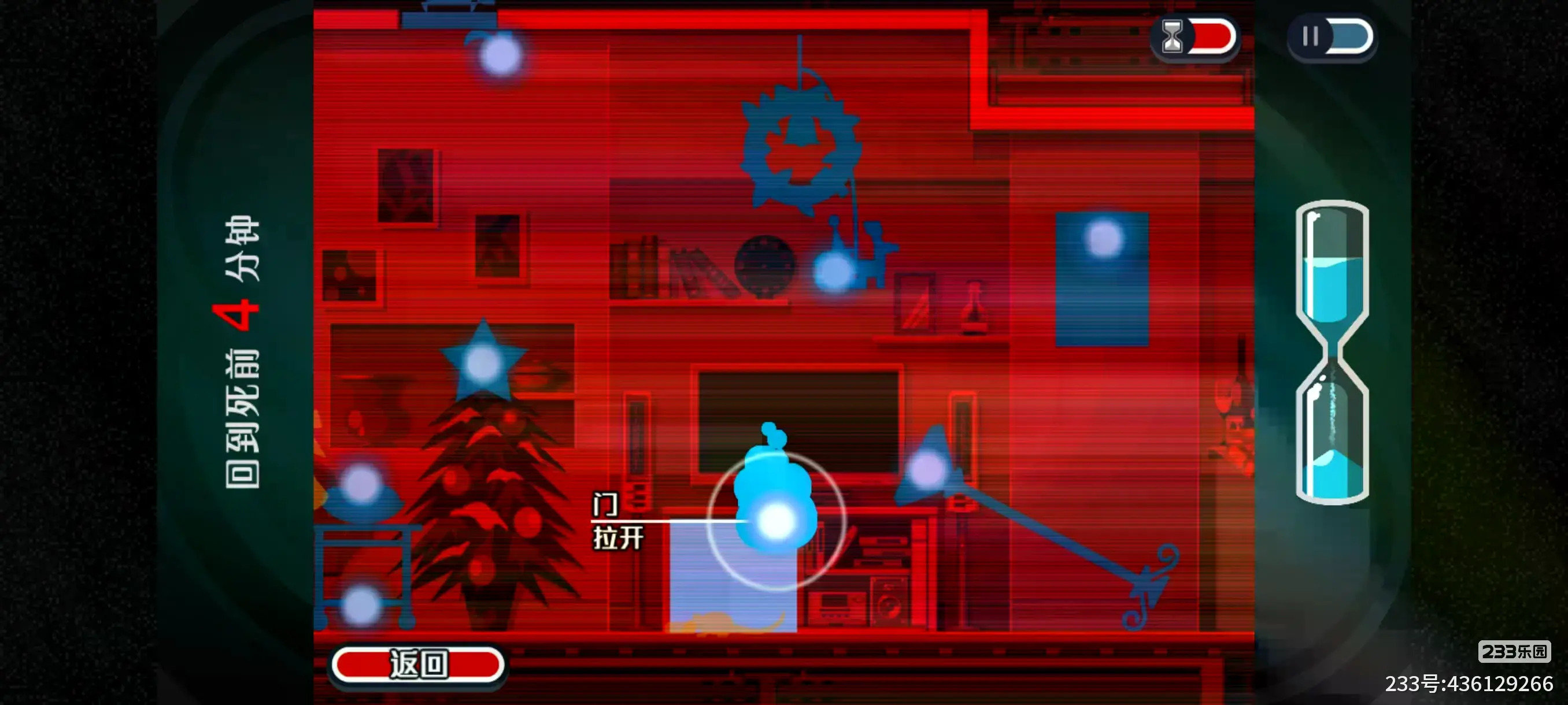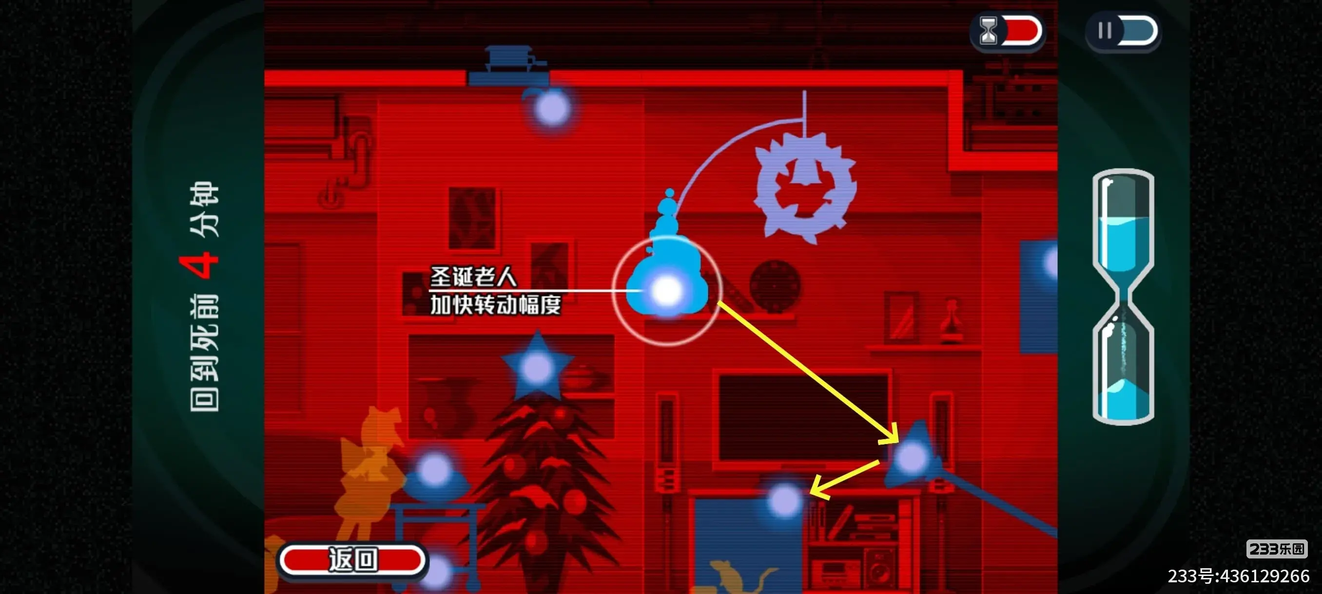其中,当我们在附身界面的时候,时间是不动的,只有途中等待圣诞老人玩具转动靠近我们需要消耗一点时间,所有尽量让圣诞老人一次靠近我们就附身上去