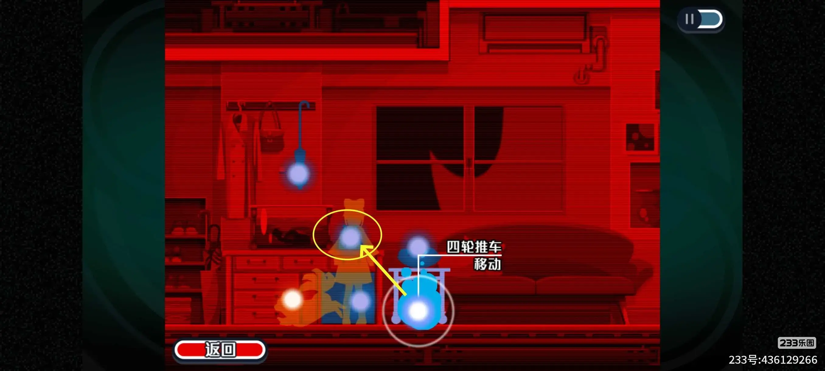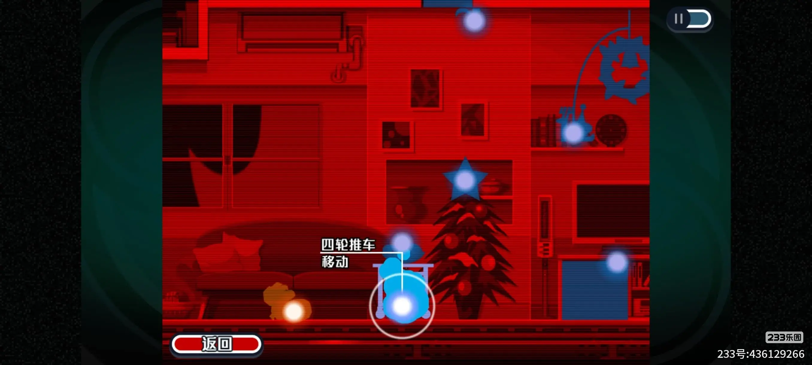 11.听完电话后,需要找到八音盒,我们先移动推车去到另外一边,然后附身到圣诞老人玩具身上,操作加速圣诞老人玩具的转动幅度,此时就能靠近房顶