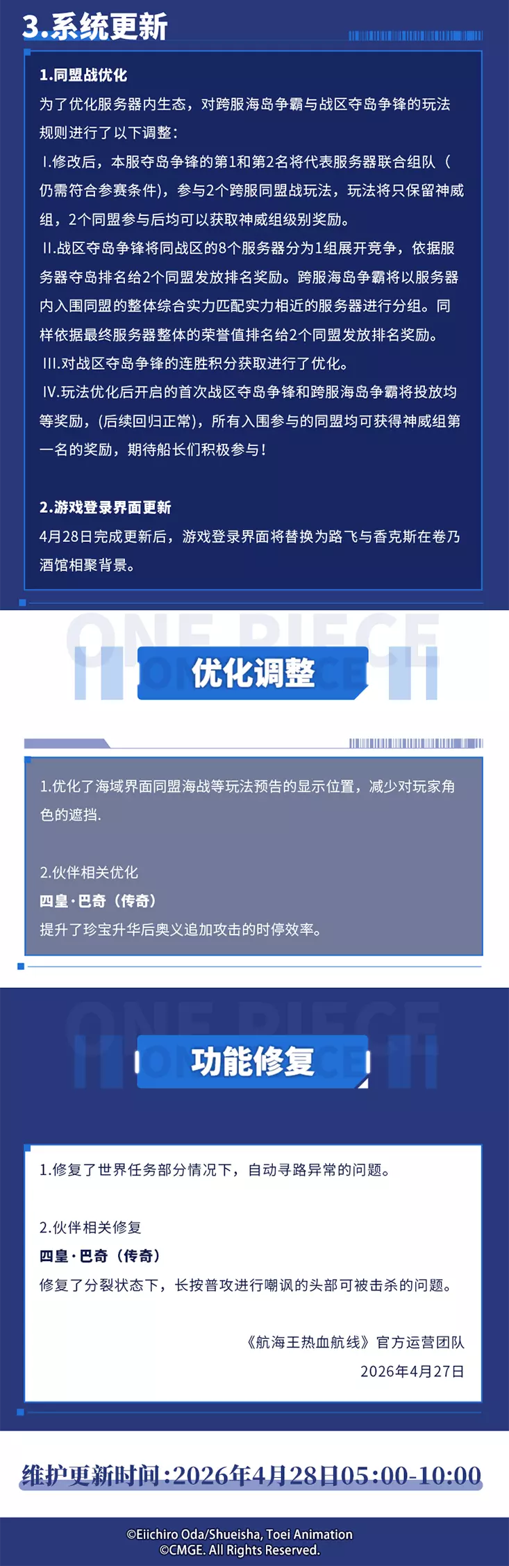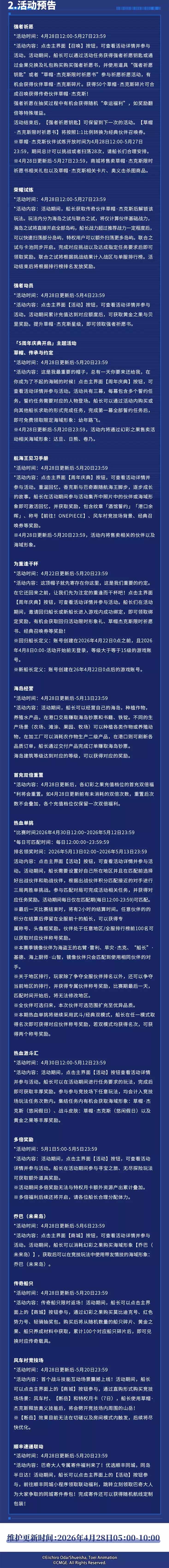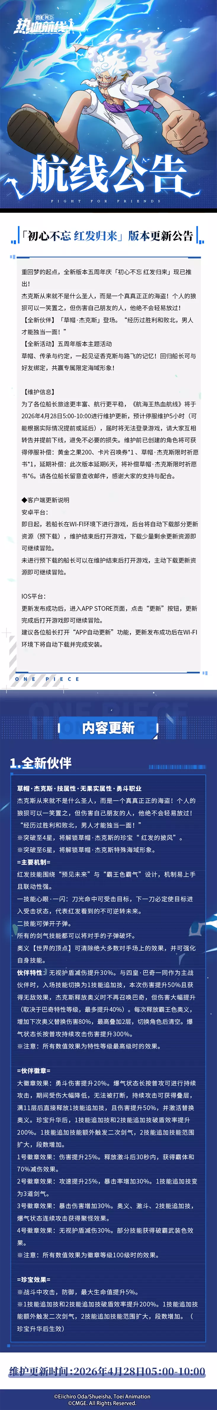 《航海王热血航线》推出五周年庆「初心不忘 红发归来」版本,全新伙伴「草帽·杰克斯」登场,同步开启五周年主题活动、强者祈愿等系列活动,还有同盟战优化等内容,游戏将于2026年4月28日5:00-10:00进行维护更新。