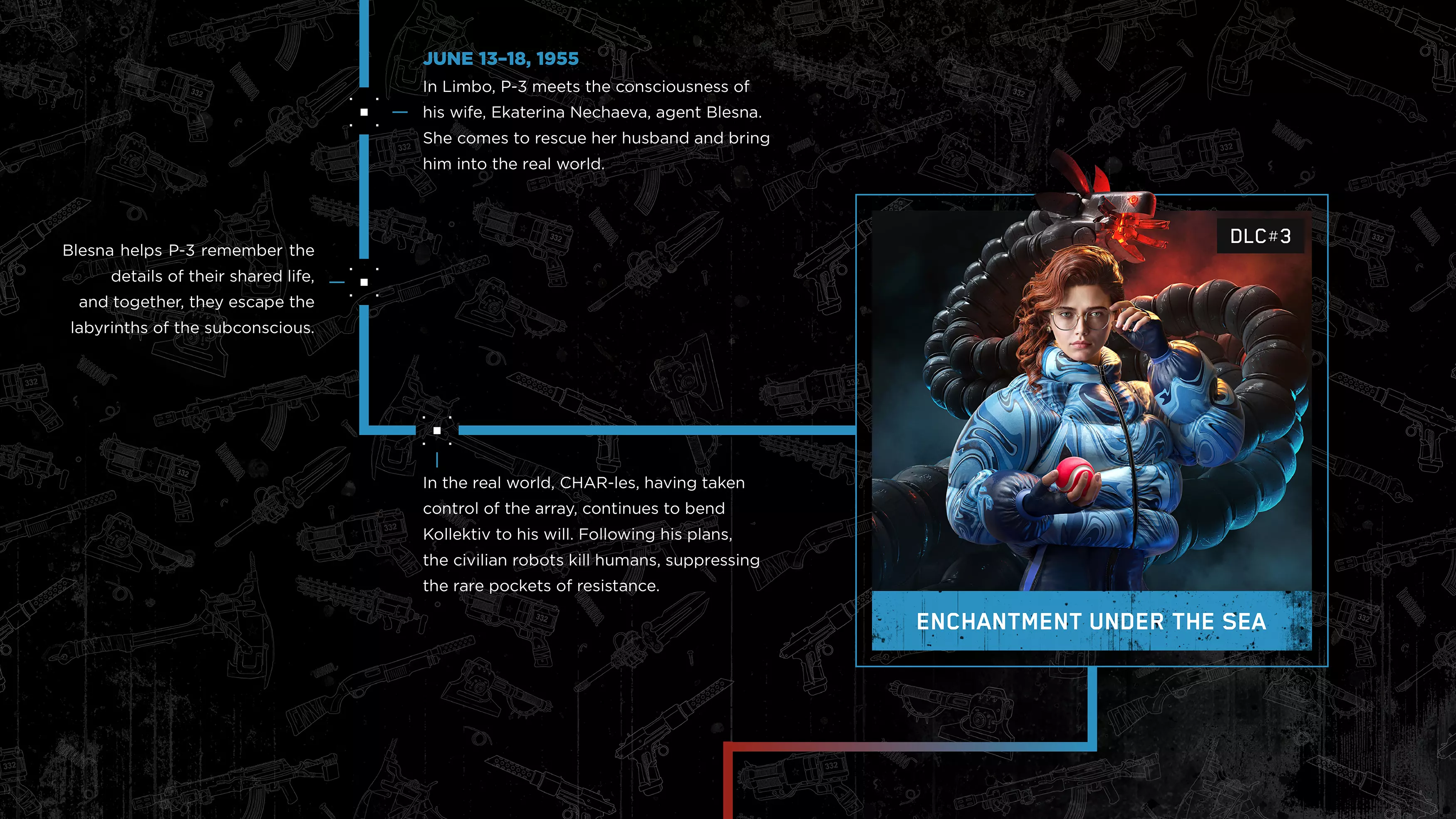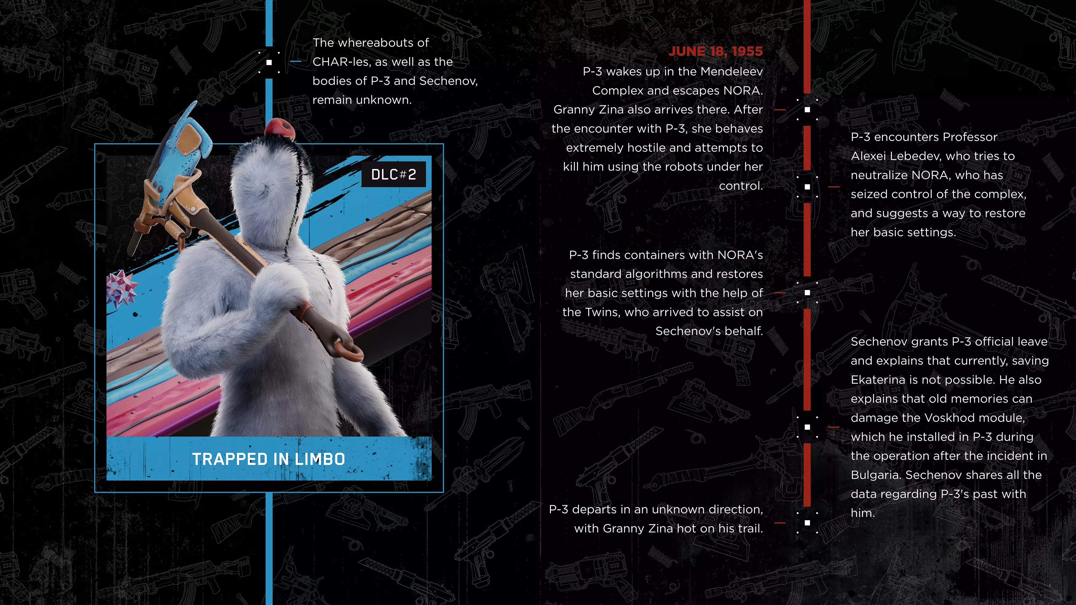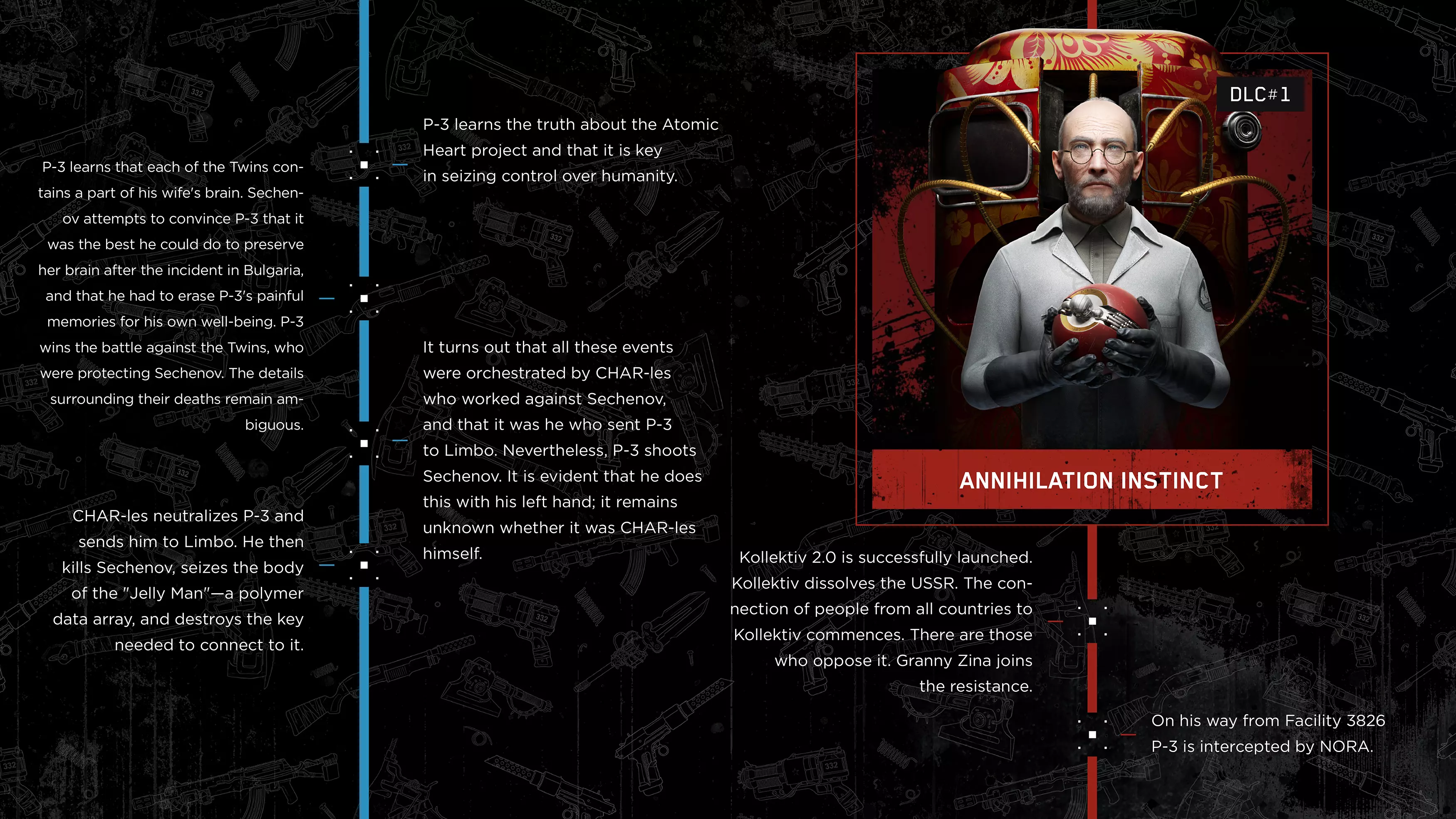 《原子之心》DLC#4最终章节已上线,官方推出DLC#4前事件时间线,梳理了主线游戏与前三部DLC的关键剧情:主角P-3在3826设施的任务经历、与Sechenov的冲突、在Limbo的遭遇,以及各DLC的核心事件,帮助玩家理清剧情脉络,更好理解DLC#4的故事。