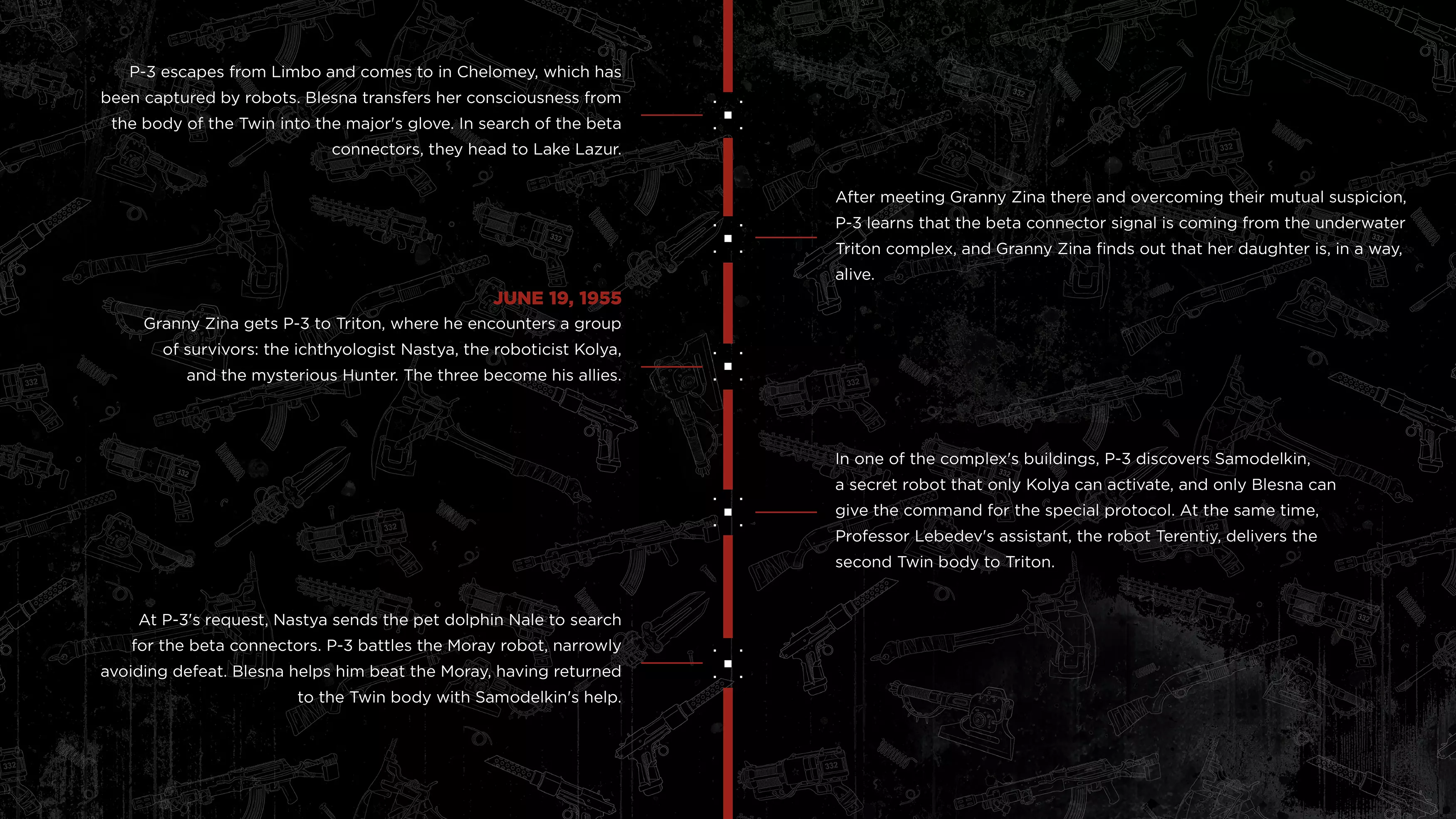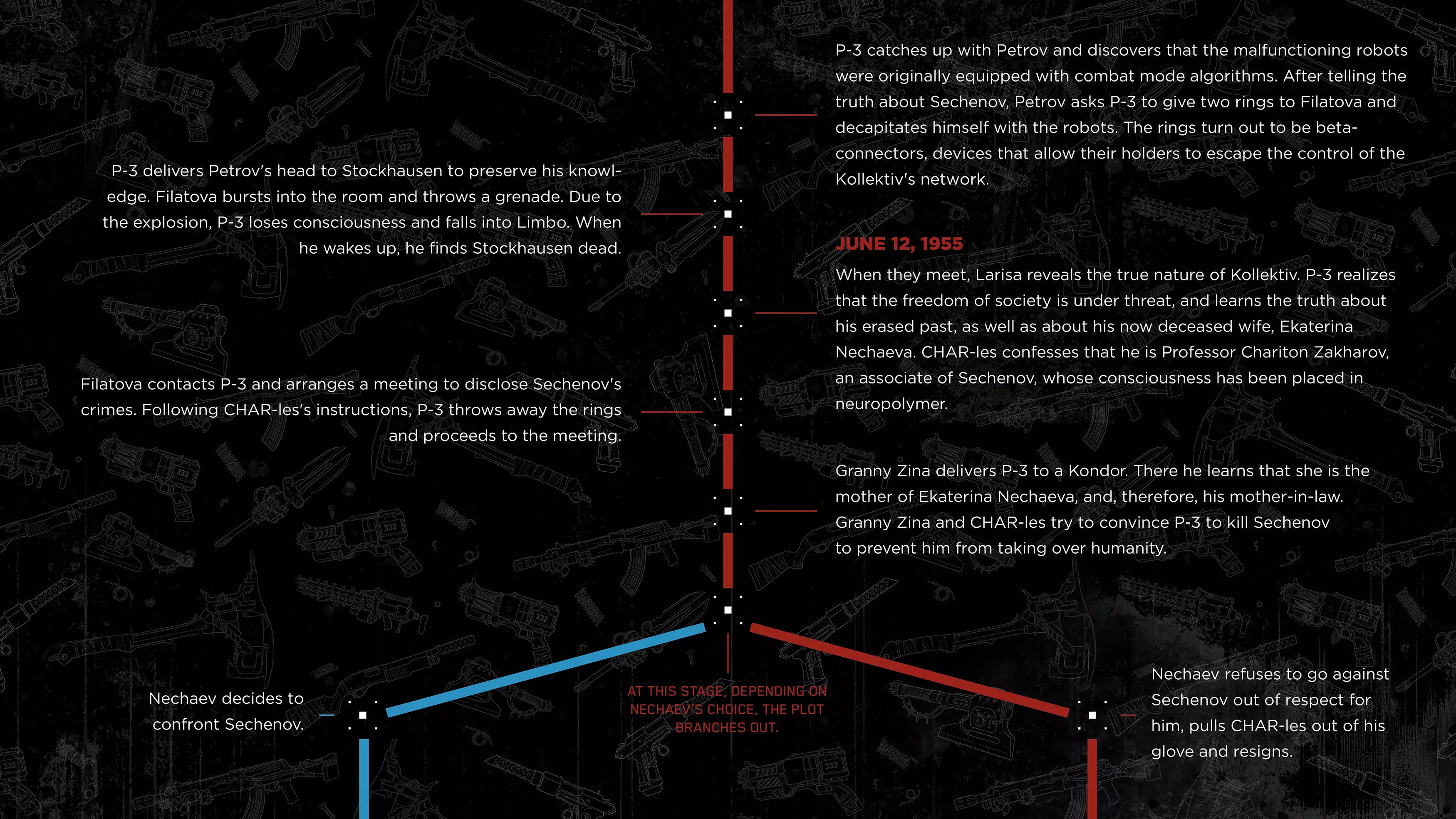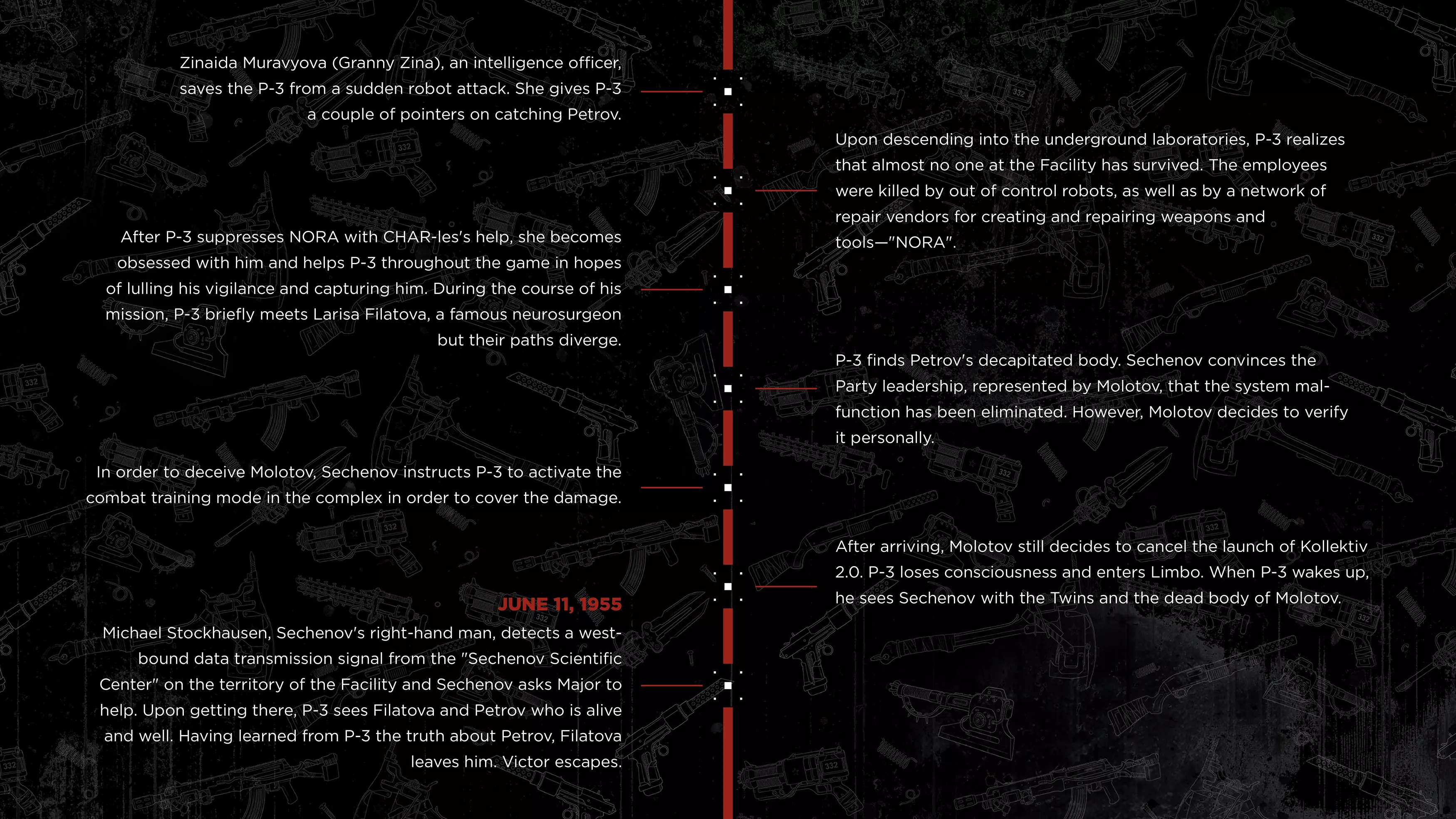《原子之心》DLC#4最终章节已上线,官方推出DLC#4前事件时间线,梳理了主线游戏与前三部DLC的关键剧情:主角P-3在3826设施的任务经历、与Sechenov的冲突、在Limbo的遭遇,以及各DLC的核心事件,帮助玩家理清剧情脉络,更好理解DLC#4的故事。