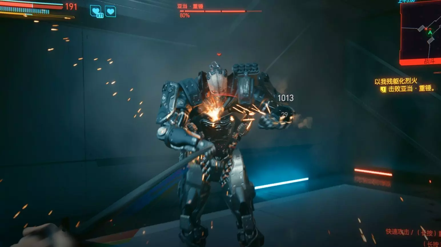 这是《赛博朋克2077》的游戏内容,展示了玩家完成“以我残躯化烈火”任务,3分58秒速通荒坂塔的过程,画面呈现了任务里乘坐电梯、和强尼交流等关键环节。