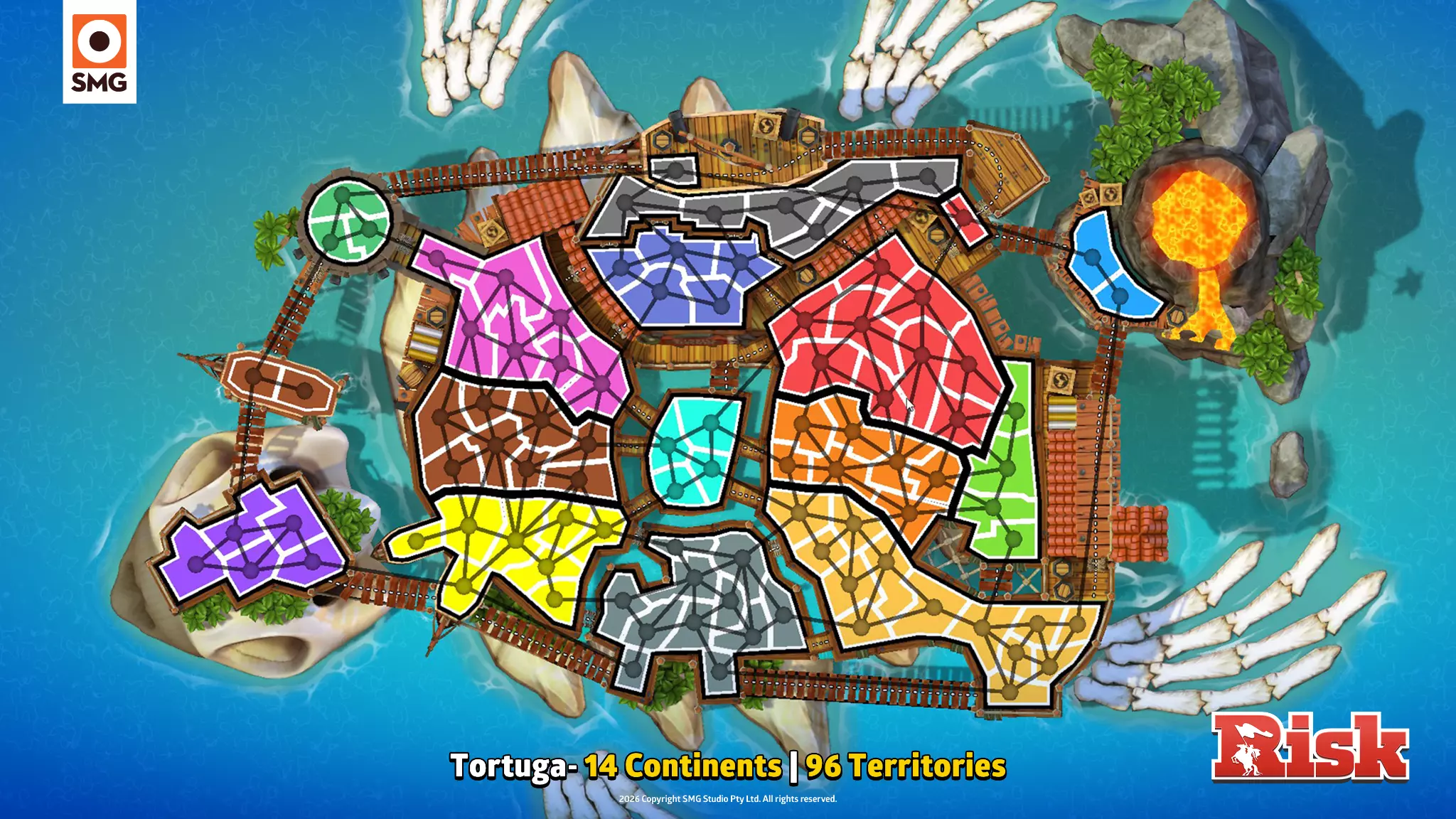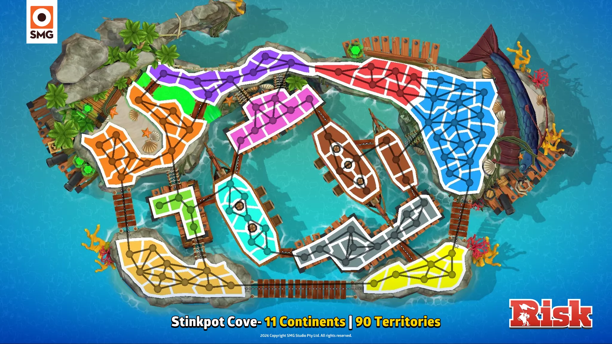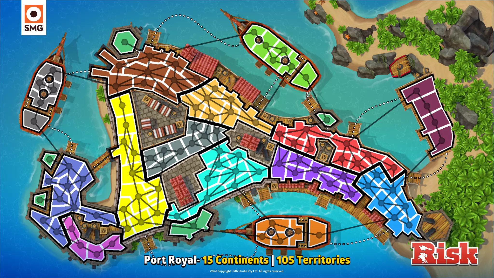 创作者初印象 “SMG一直在倾听玩家的声音,并为我们带来了一些超棒的新地图。我非常期待能在排位赛中大量游玩这些地图。”——Kylted “海盗地图包的细节太棒了。那些酷炫的装饰元素真的很吸引我。”——WithTheGoodHair “海盗地图会让雪地变成雪球的战场。”——typicalxkiefer “这些新的《RISK》海盗地图不仅拥有令人惊叹的景观,其创意加成和路径设计也非常出色!”——AKASpudTopped “我喜欢这些地图的复杂性,以及它们在原版海盗主题地图包基础上的改进。”“——OliveXC “丰厚的奖励,危险的咽喉要道……这些全新的海盗地图局势可能会迅速逆转。你得早点行动!”——Chbrosz 皇家港口 15个大陆 | 105个领地 诅咒骰子、鱿鱼摔跤、巫毒娃娃、藤壶打蜡——这个海盗天堂应有尽有。 “这张地图非常大,有丰厚的奖励,而且当你启用暴风雪模式时,还能看到许多疯狂的路径诡计和1点兵力的区域。”——Kylted