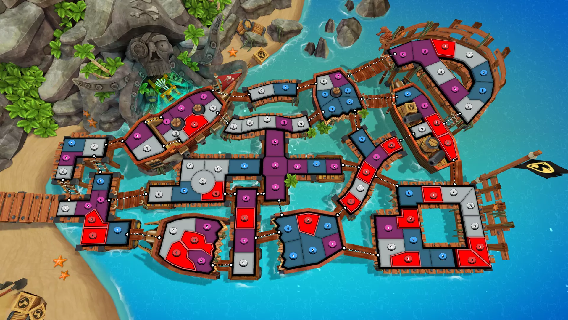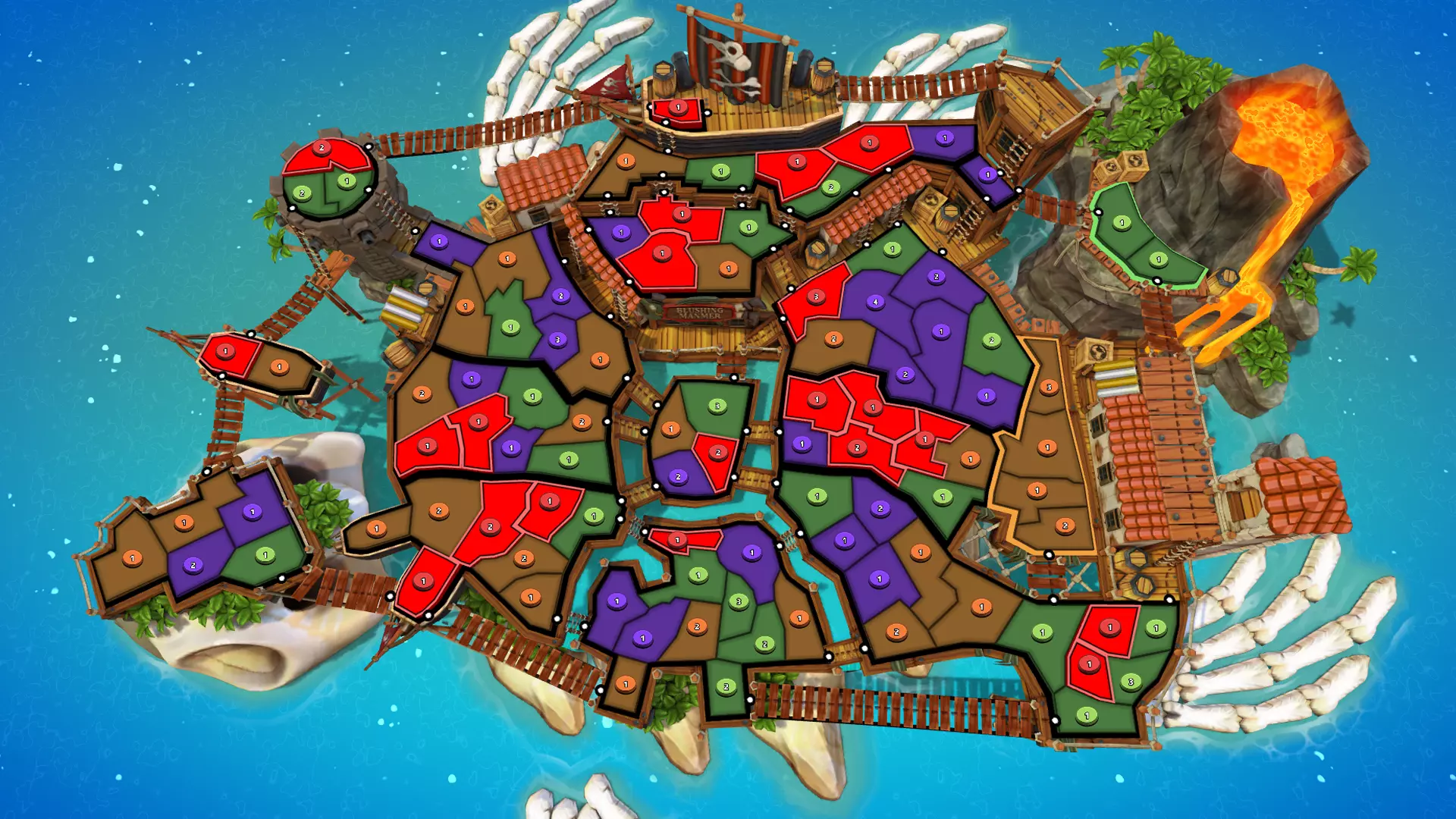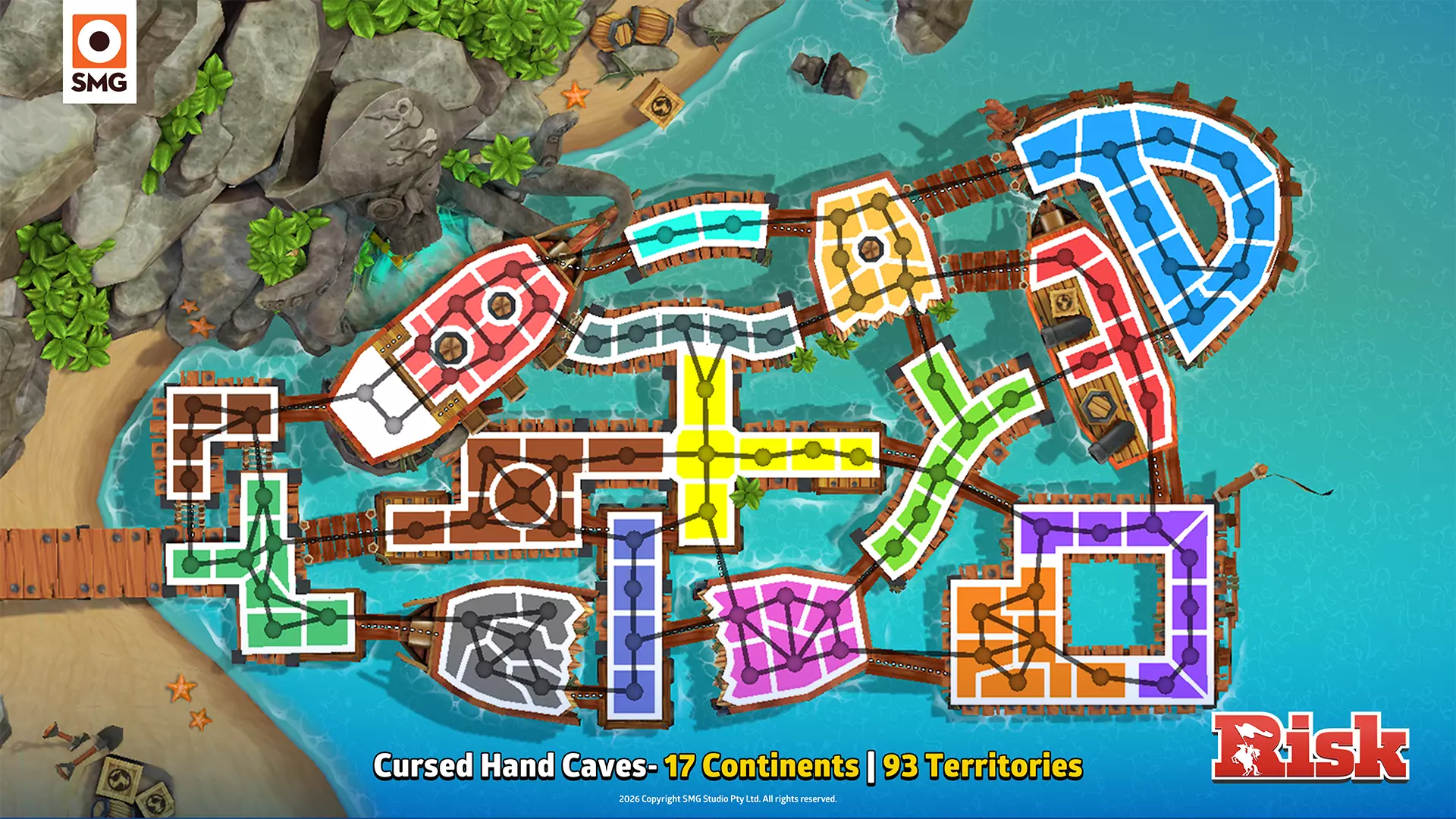 创作者初印象 “SMG一直在倾听玩家的声音,并为我们带来了一些超棒的新地图。我非常期待能在排位赛中大量游玩这些地图。”——Kylted “海盗地图包的细节太棒了。那些酷炫的装饰元素真的很吸引我。”——WithTheGoodHair “海盗地图会让雪地变成雪球的战场。”——typicalxkiefer “这些新的《RISK》海盗地图不仅拥有令人惊叹的景观,其创意加成和路径设计也非常出色!”——AKASpudTopped “我喜欢这些地图的复杂性,以及它们在原版海盗主题地图包基础上的改进。”“——OliveXC “丰厚的奖励,危险的咽喉要道……这些全新的海盗地图局势可能会迅速逆转。你得早点行动!”——Chbrosz 皇家港口 15个大陆 | 105个领地 诅咒骰子、鱿鱼摔跤、巫毒娃娃、藤壶打蜡——这个海盗天堂应有尽有。 “这张地图非常大,有丰厚的奖励,而且当你启用暴风雪模式时,还能看到许多疯狂的路径诡计和1点兵力的区域。”——Kylted