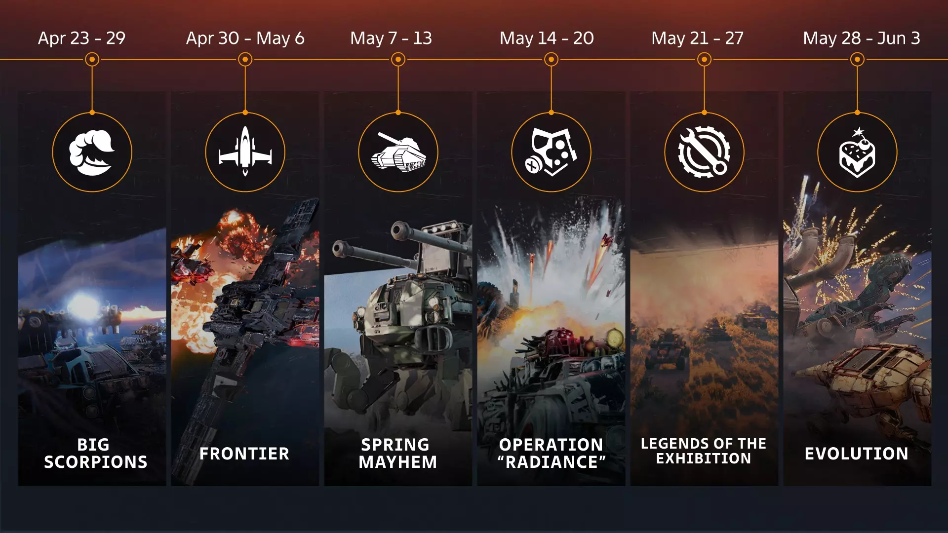 “柠檬烟雾”涂装; 两个“握把”贴纸; 补给箱:“军事储备箱”、“人道主义援助箱”和“后勤专家箱”; 100个工程师徽章。 “进化”乱斗回归 注意!该模式将从5月28日开放至6月3日! “进化”是一种玩家需同时面对其他玩家和AI对手的乱斗模式。战斗使用预设载具。 与上次推出相比,增加了小型载具的数量以让开局更顺利,并新增了“雄狮”进化阶段及相关战斗事件,敬请留意! 载具没有武器:摧毁对手的唯一方式是用你的载具撞击他们。撞击比你小的对手会增加你的载具尺寸。达到特定尺寸后,载具外观也会发生变化。撞击比你大的对手会摧毁你的载具,重生后尺寸重置为初始大小。 目标是在时间结束前获得最多积分。载具越大,能“吞噬”的敌人种类越多,积分获取速度也相应越快。 请注意:地图上存在AI敌人,即使使用最大载具也无法摧毁它们。若遇到此类敌人,请立即远离。 该模式战斗的奖励为废金属。 5月28日至6月10日期间,游戏内将有创世战车生日惊喜等待你。记得登录并领取。特殊挑战奖励: