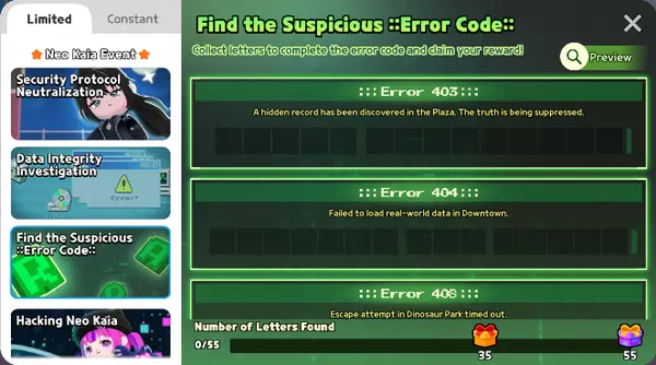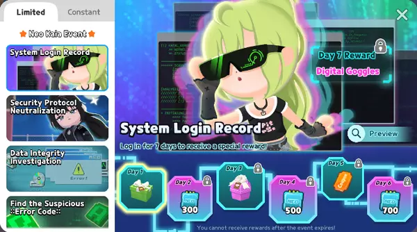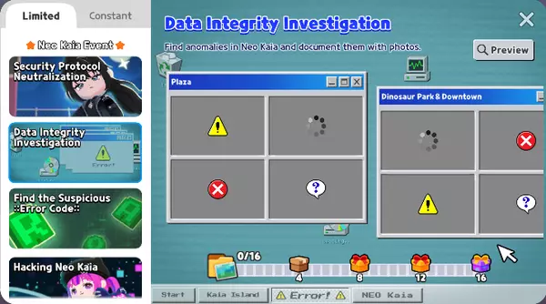 根据已完成的代码,你可以获得【ERROR】名牌和防护力场平台! * 活动任务将在活动期间按顺序解锁。 ▶ 逃脱任务4 | 突破新凯亚防火墙 游玩小游戏即可获得特殊奖励!