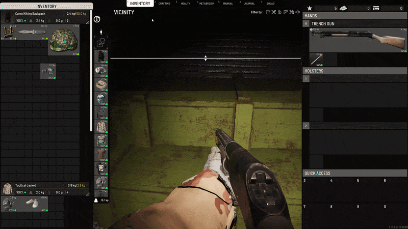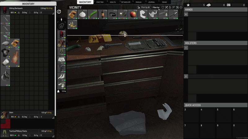 例如,你发现身边的地上散落着一堆不同的物品。看起来像是一个典型的陷阱,但你又饿又绝望,希望能找到一些食物。现在,你无需手动查看所有物品并逐一捡起,只需筛选出食物类物品,然后按下一个按钮就能将它们全部捡起。就是这么简单。只需两次鼠标点击,而不是数十次甚至更多。这样可以减少你在开阔地带暴露的时间,避免他人夺走你的物品。